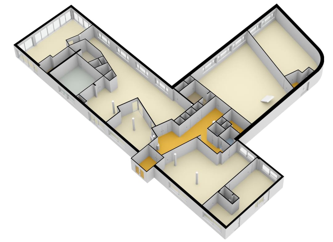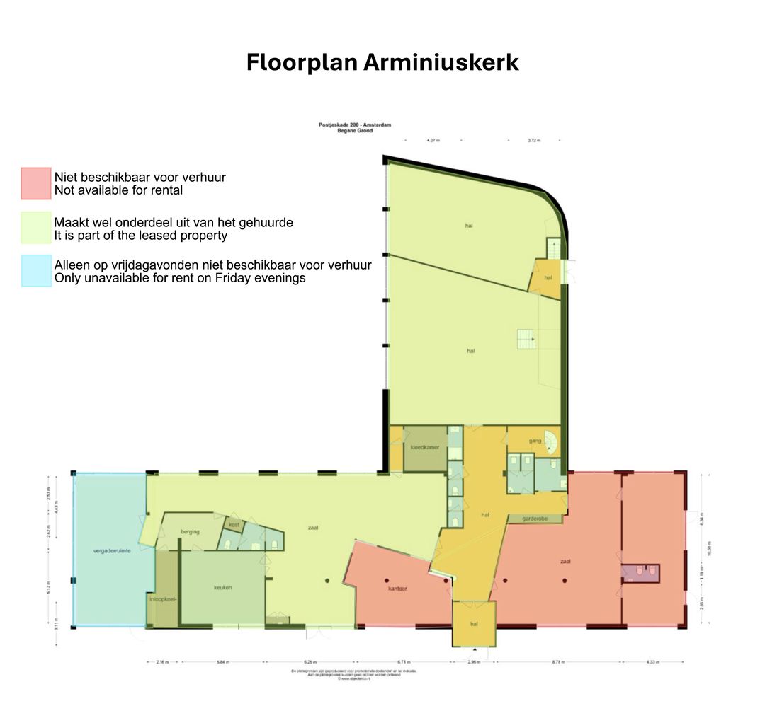 • De rechtervleugel wordt doordeweeks gebruikt als kinderdagverblijf en in het weekend als kinderkerk. Daarom is deze ruimte niet beschikbaar voor verhuur. Op de plattegrond is deze gemarkeerd in roze.