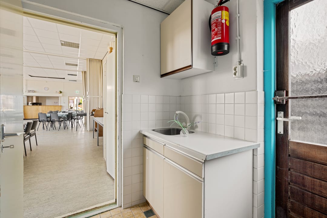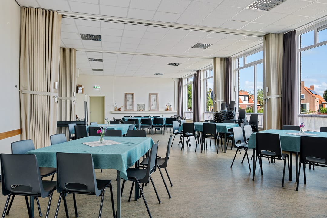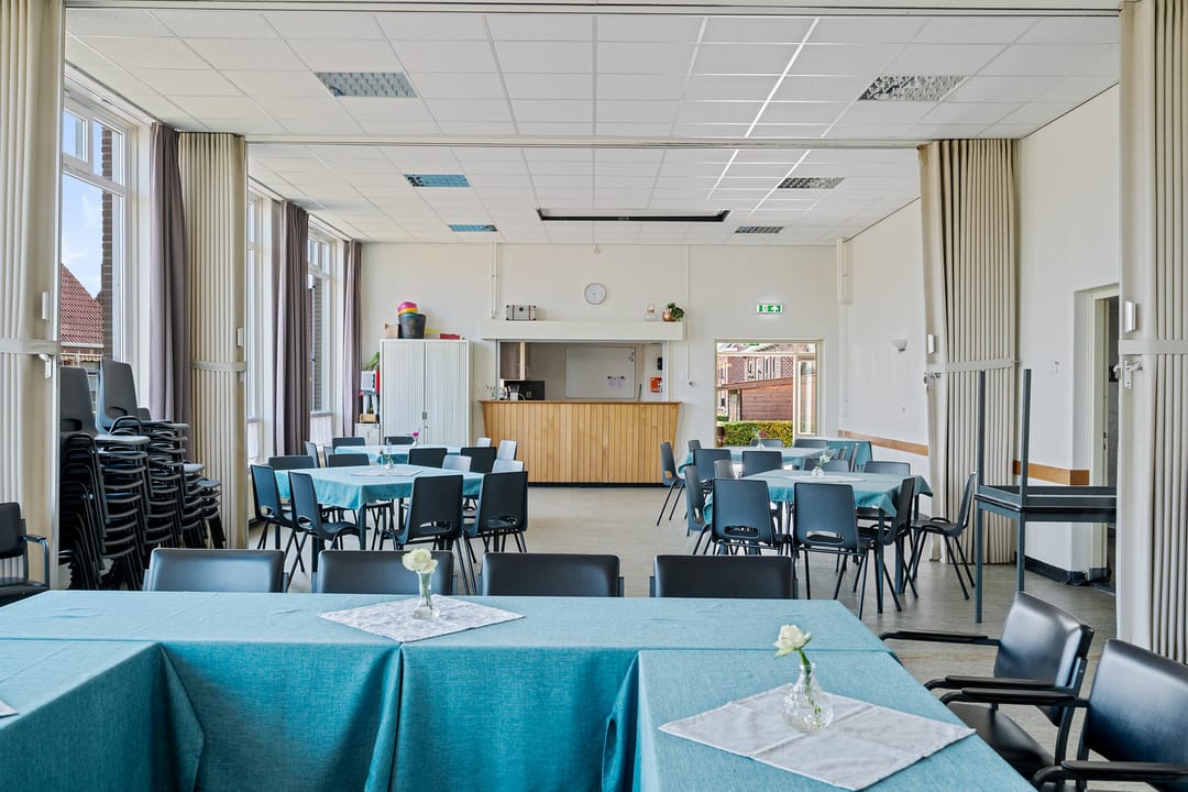 entree/voorportaal met opgang naar balkon, kerkzaal, gang, entree/hal, keuken met uitgiftebalie en vaste kasten, toiletgroep met urinoir en toilet, zij entree met keukenblokje, achterzaaltjes, kerkzaal, kelderruimte, damestoilet en opgang naar 2e balkon. fietsenberging.