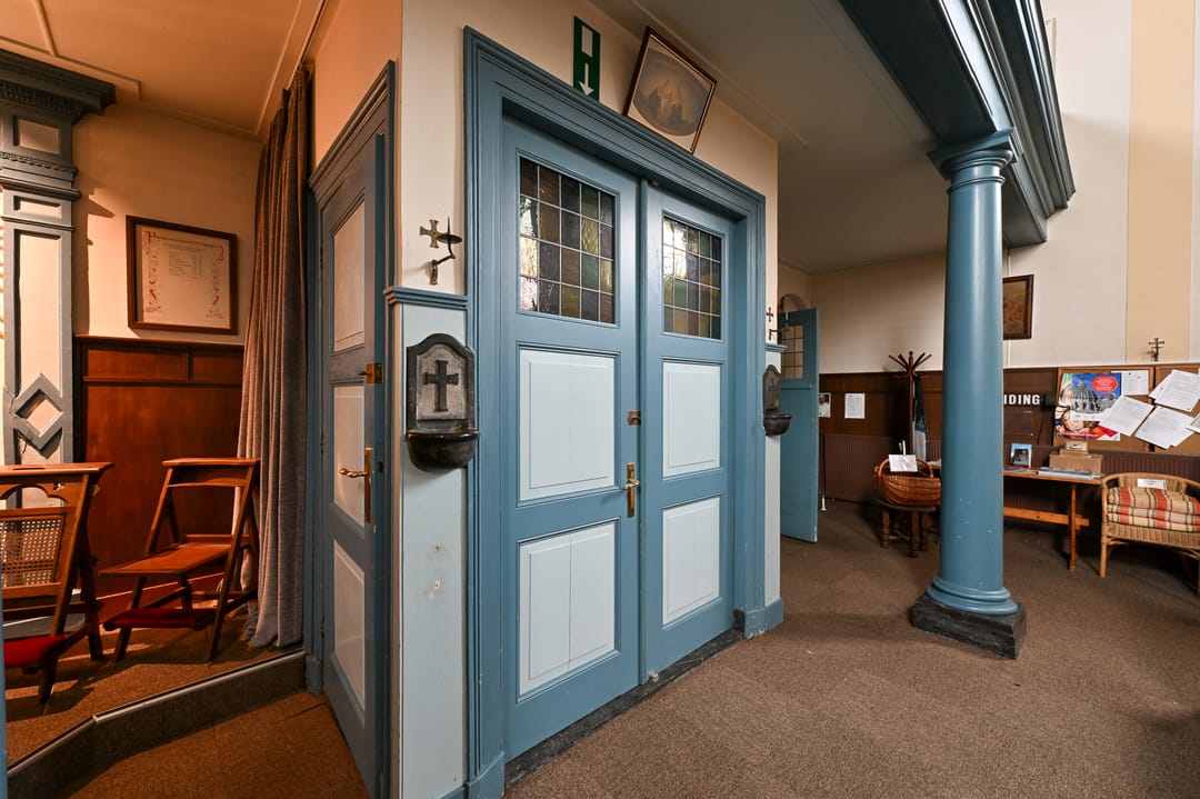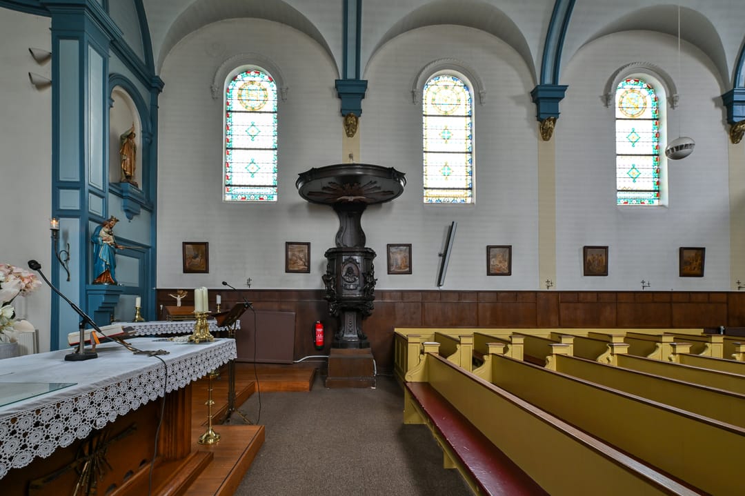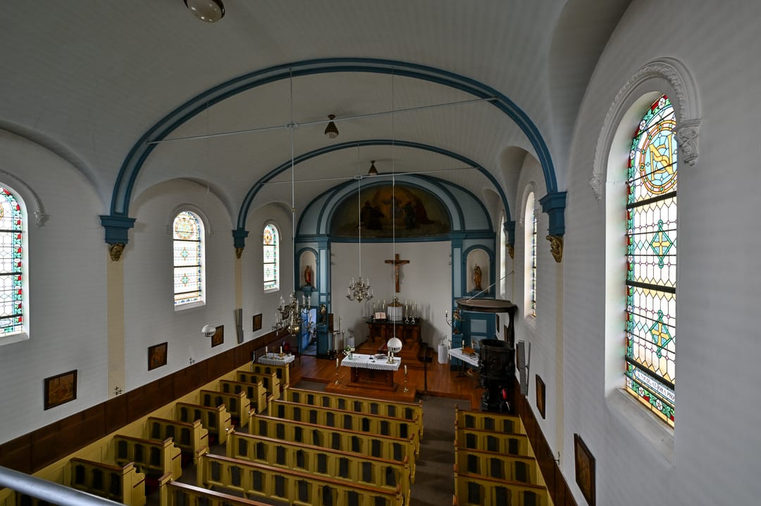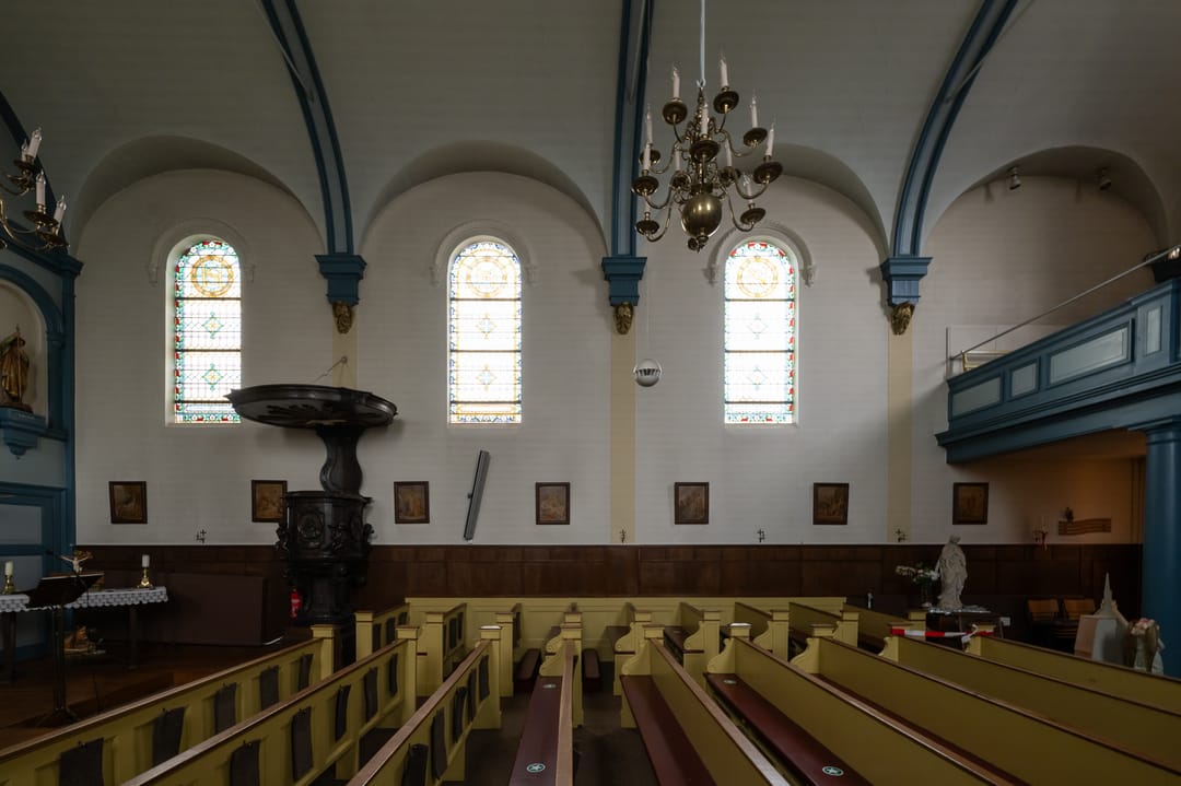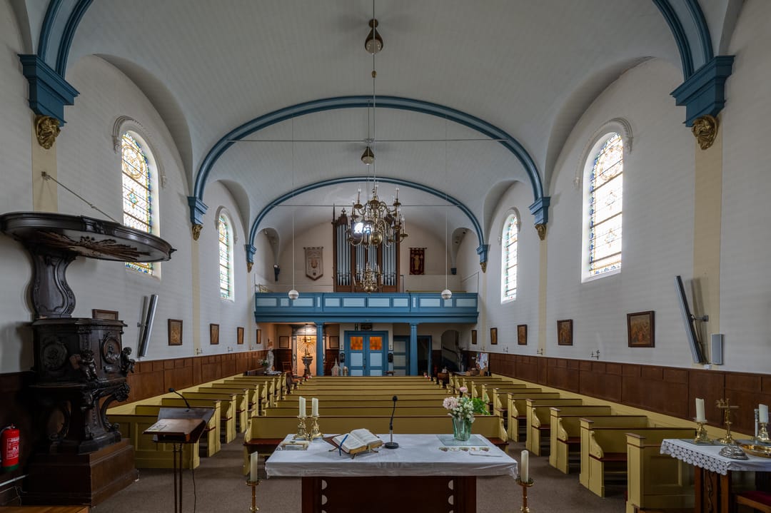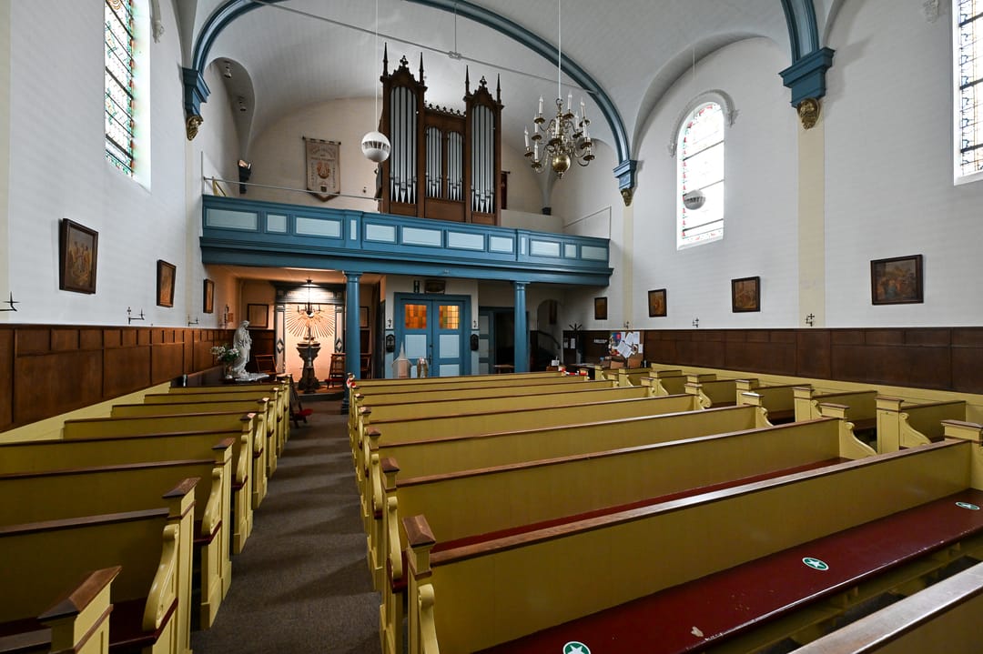 De kerk is 9.00 bij 19.35 en heeft een entree, met daarnaast een kast en trap naar het gedeelte waar het orgel is geplaatst. Aan de andere kant treft u het altaar aan met daarachter een kamer met kasten. Via een deur loopt u door naar de pastorie.