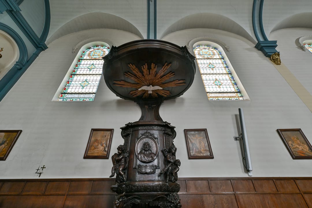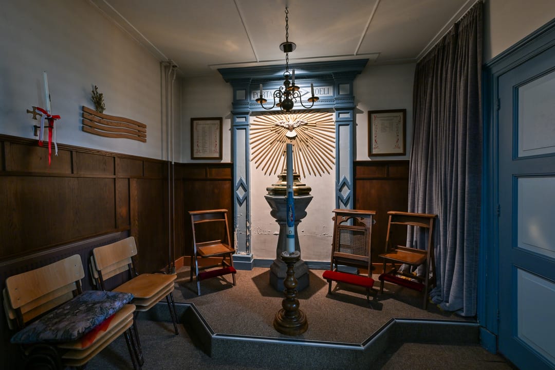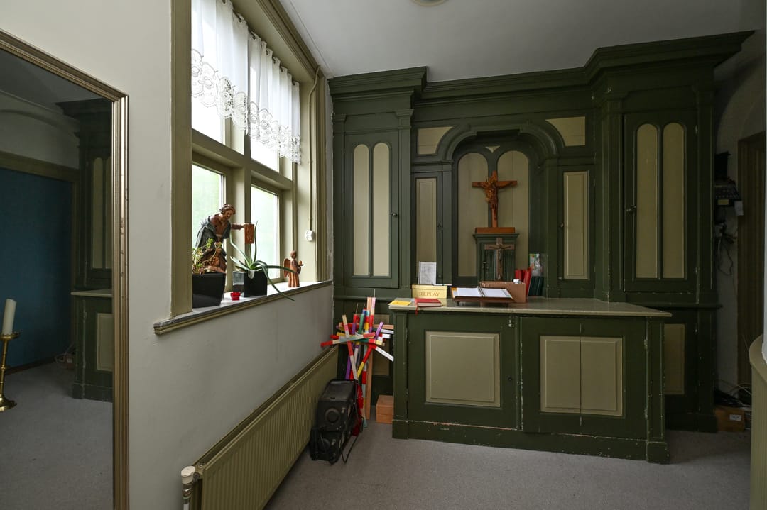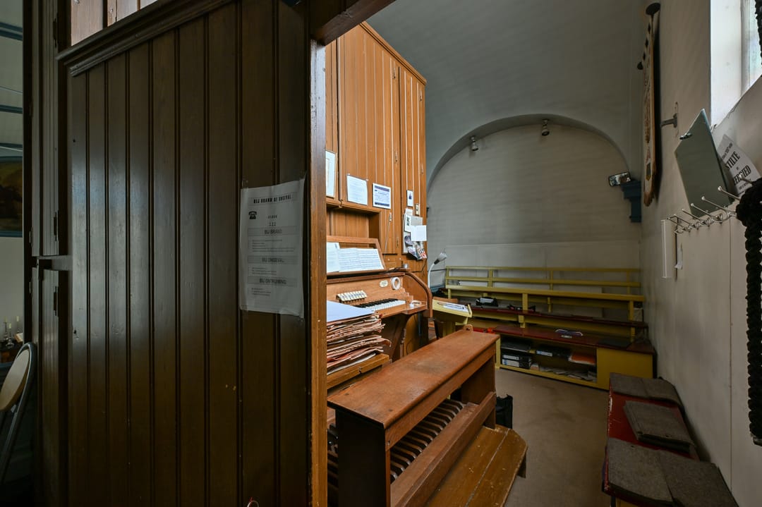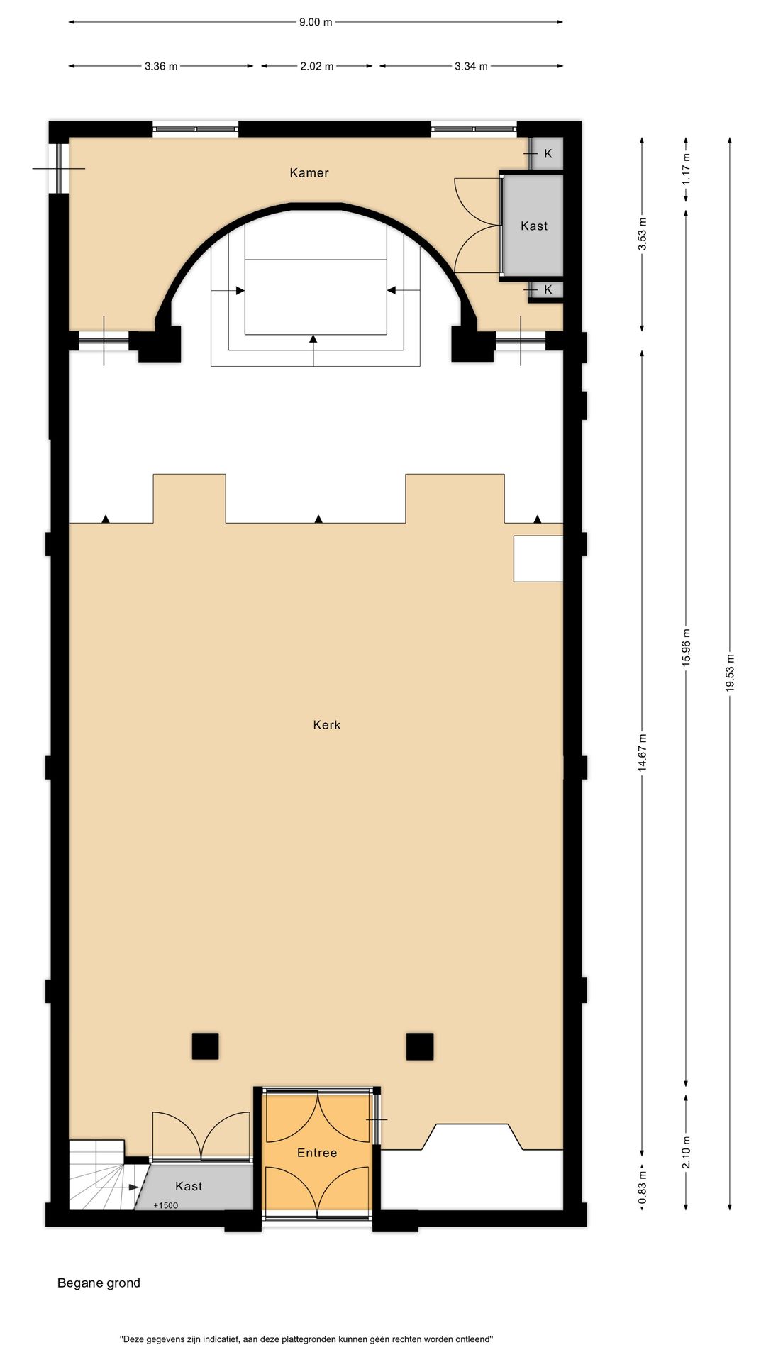 De kerk is 9.00 bij 19.35 en heeft een entree, met daarnaast een kast en trap naar het gedeelte waar het orgel is geplaatst. Aan de andere kant treft u het altaar aan met daarachter een kamer met kasten. Via een deur loopt u door naar de pastorie.