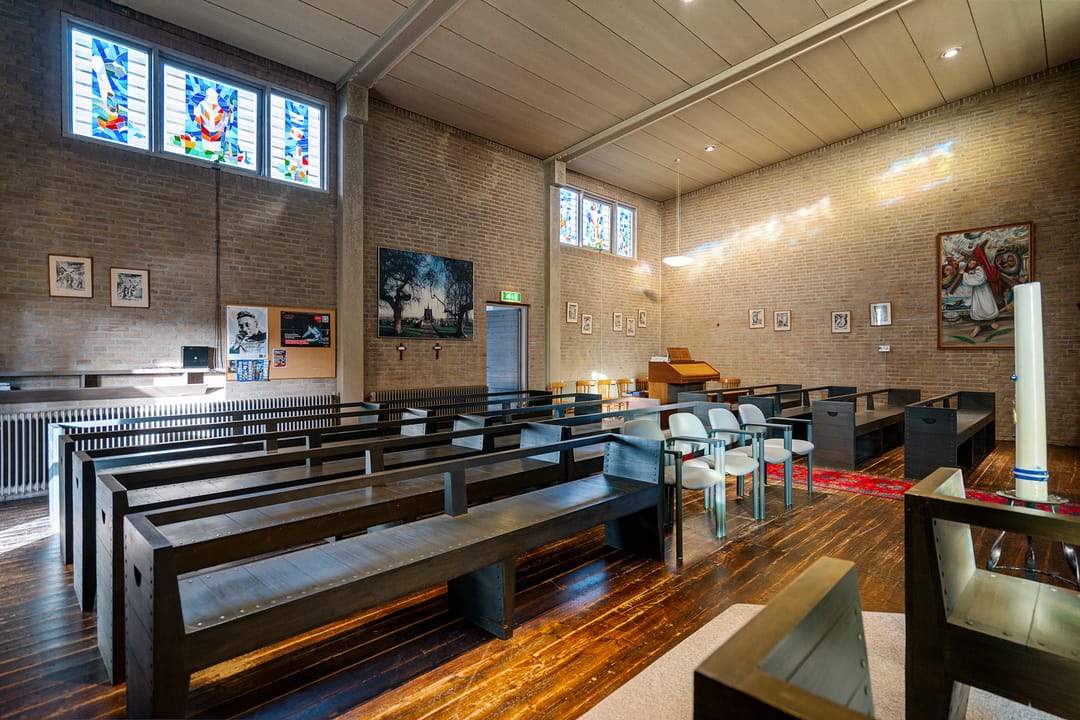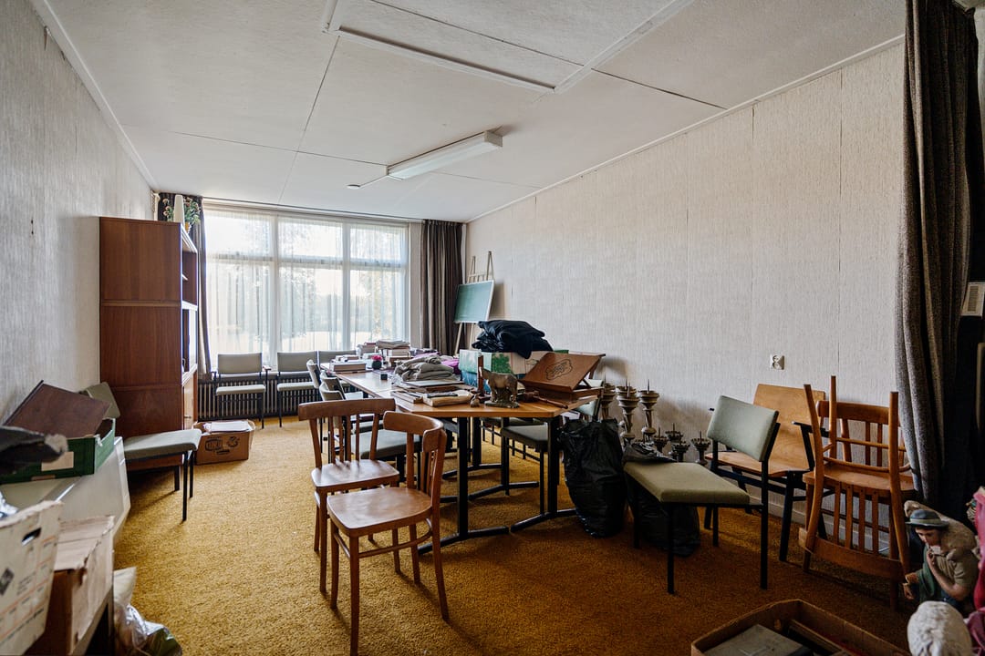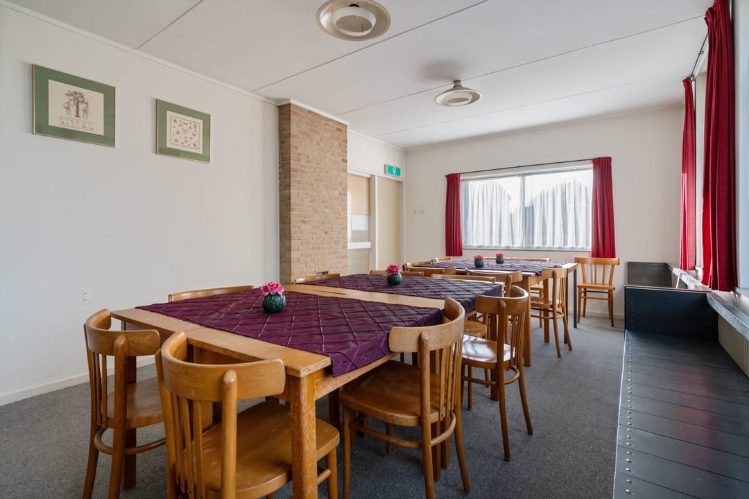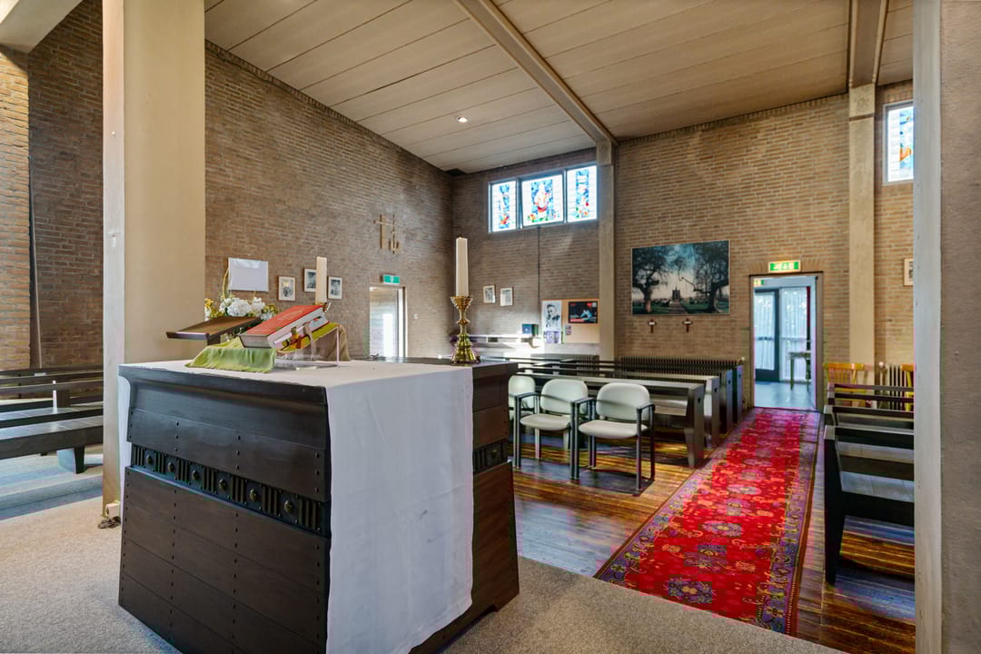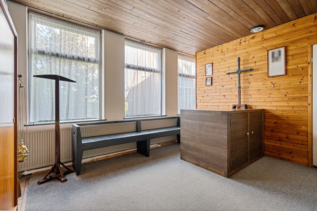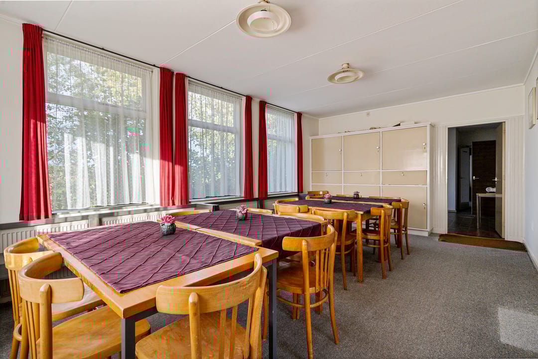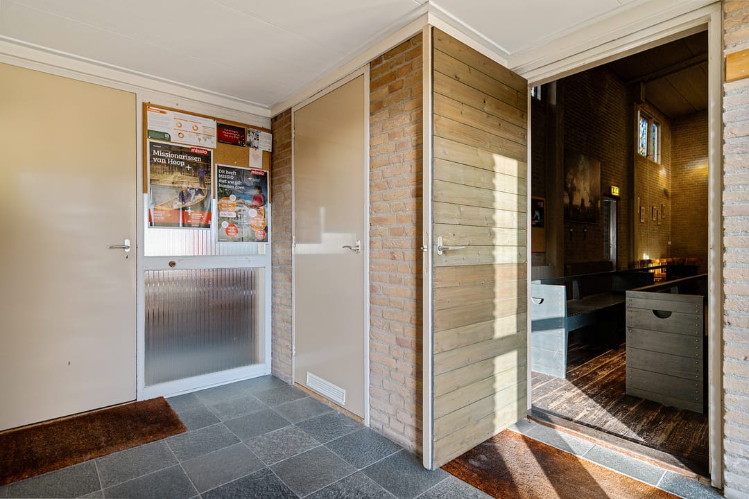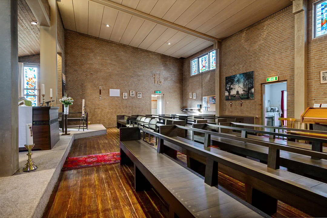 Het geheel bestaat nu uit een entree met meterkast, toegang tot de huidige kerkzaal, diverse kantoorruimtes, een tussenhal met toegang tot een badkamer met vaste wastafel, douche en toilet. Voorts een keuken en toilet met voorportaal en aansluitende een eetkamer/ontspanningsruimte.