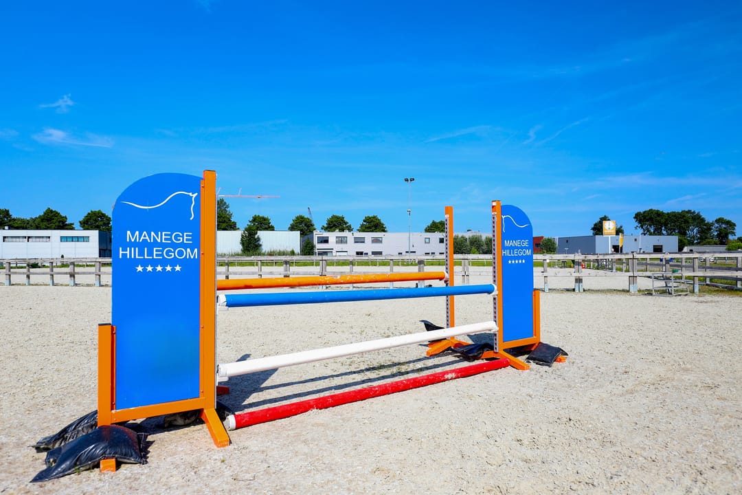 Buiten tegenover de kantine en het terras bevinden zich de outdoor rijfaciliteiten. Een ruime springtuin én outdoor rijbaan.
