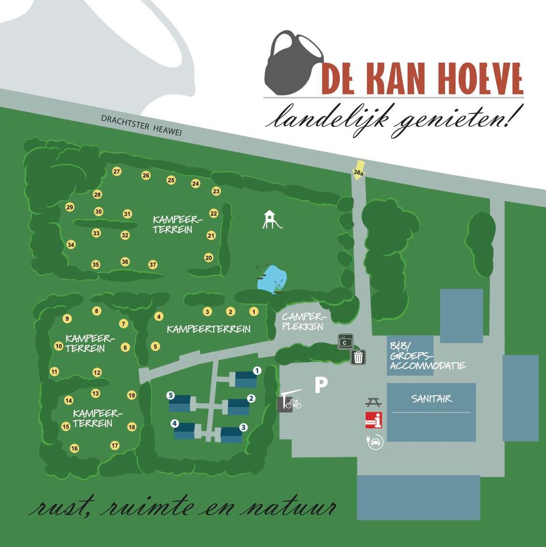Het idyllisch kampeerterrein van ‘De Kan Hoeve Recreatie en accommodaties’ is in 2015 gerealiseerd door de huidige eigenaar. Na staken van het agrarische bedrijf is de camping opgezet. De prachtige minicamping is de perfecte uitvalsbasis voor watersportliefhebbers, wandelaars en fietsers. Totaal zijn er 35 ruime toeristische kampeerplaatsen aanwezig, inclusief 4 verharde camperplaatsen. De kampeerplaatsen zijn geschikt voor campers, tenten, auto’s/bus met daktenten en caravans. Elke kampeerplaats beschikt over een 10 ampère elektra aansluiting en er zijn diverse watertappunten aanwezig.