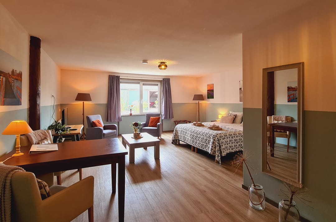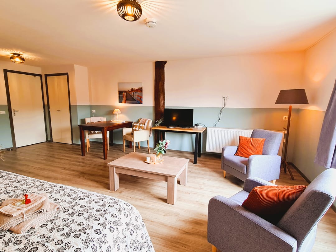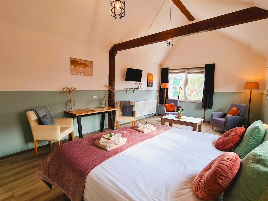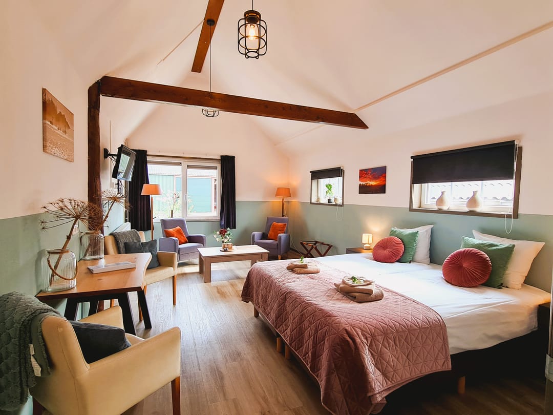 Ontdek de charme van B&B De Kan Hoeve. De 4 duurzame B&B kamers zijn in 2014 gerealiseerd in de Friese stal. Het zijn luxe hotelkamers met zitje, tv en hoge tafel. De B&B kamers worden ook gezamenlijk verhuurd als groepsaccommodatie. Er is een capaciteit voor 11 personen verdeeld over 4 kamers. Alle kamers hebben losse bedden. Op 3 kamers staan dan 3 bedden en op 1 kamer staan 2 bedden. Alle kamers zijn volledig ingericht.