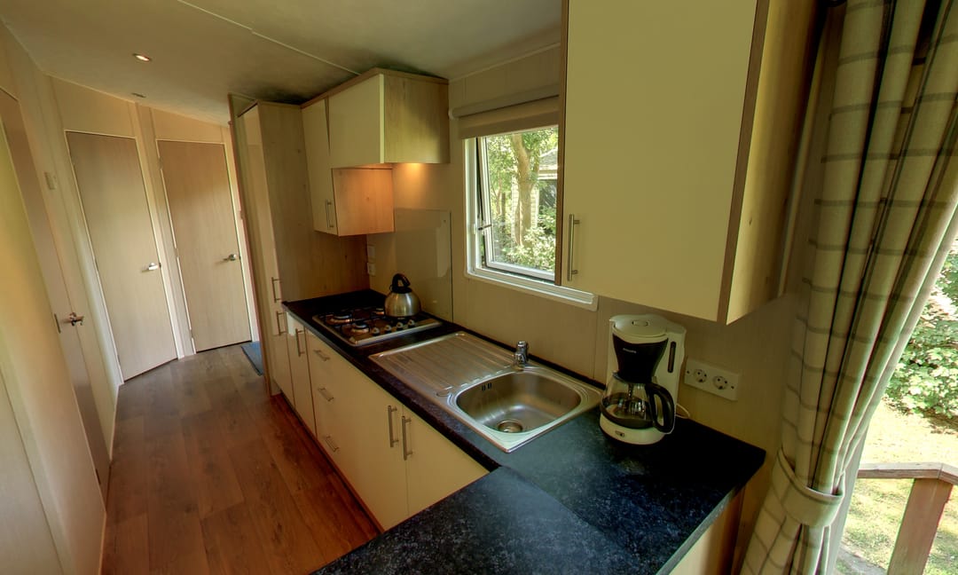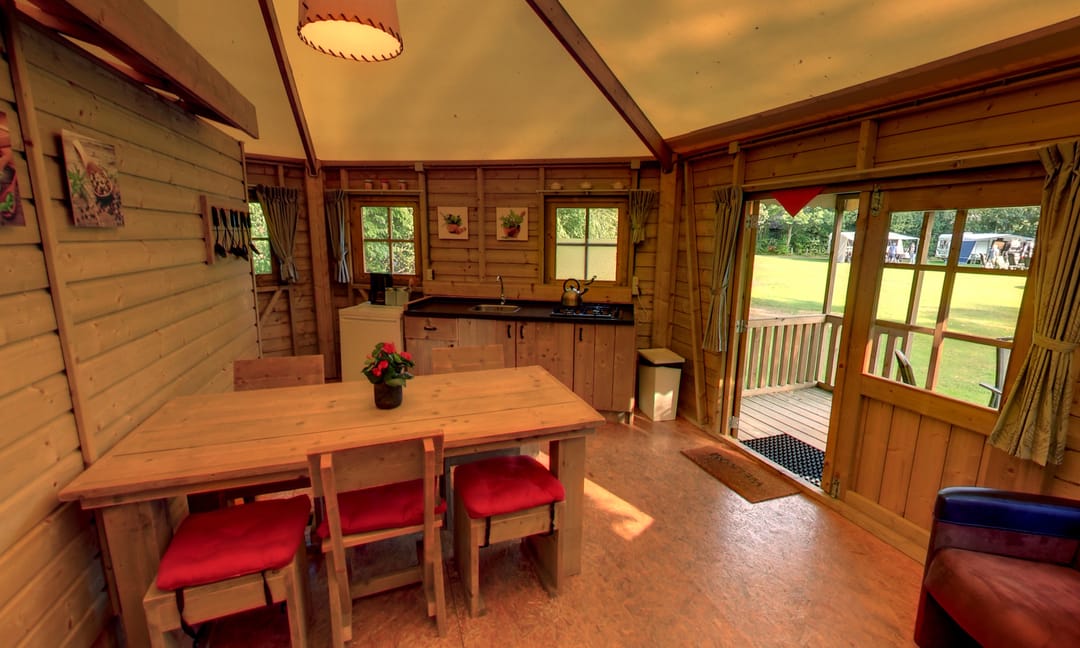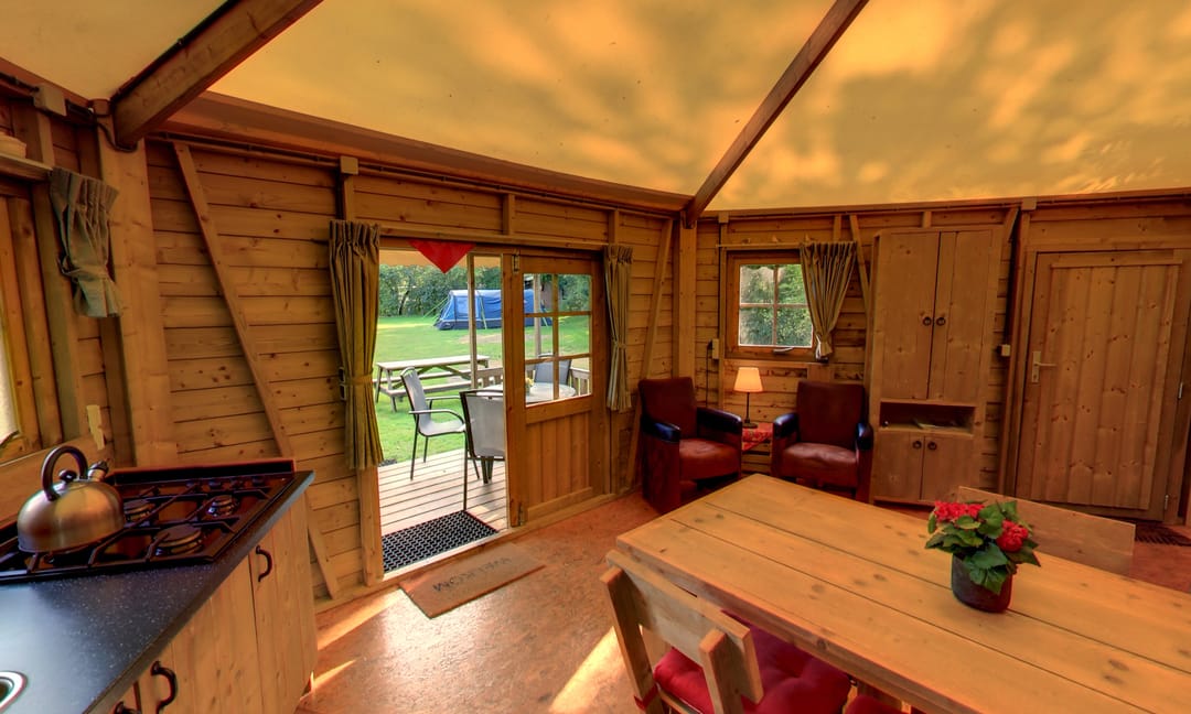 Het tenthuis is voorzien van een keukentje met fornuis en daarbij een koelkast, zithoek, separaat toilet en 2 slaapkamers.