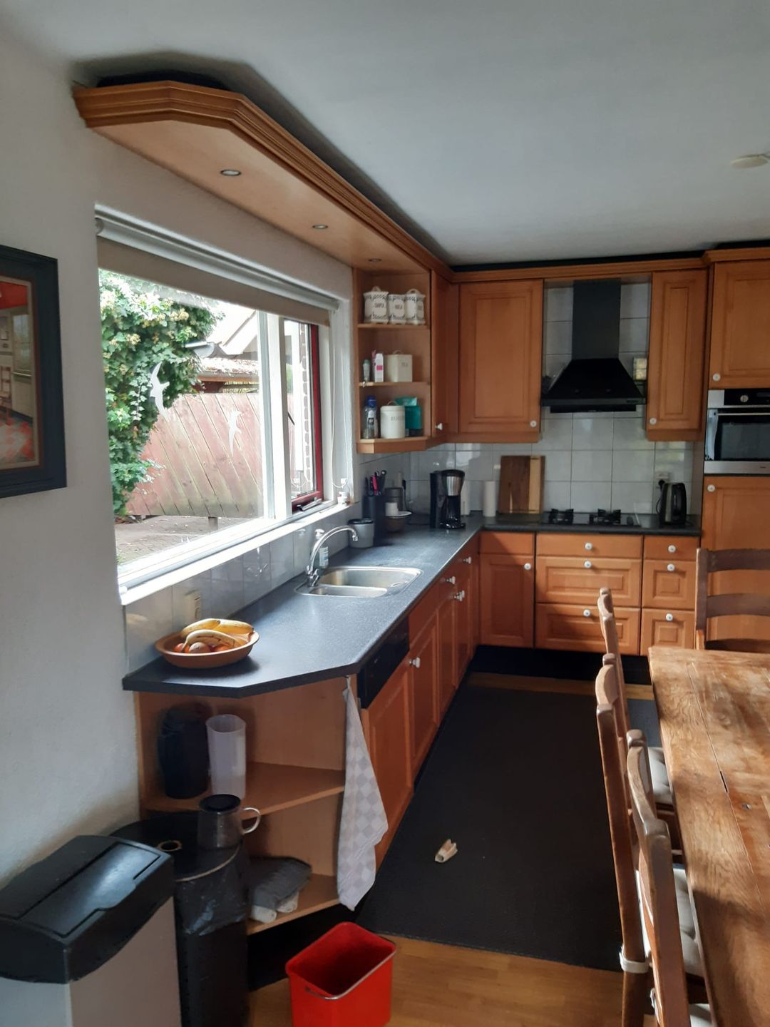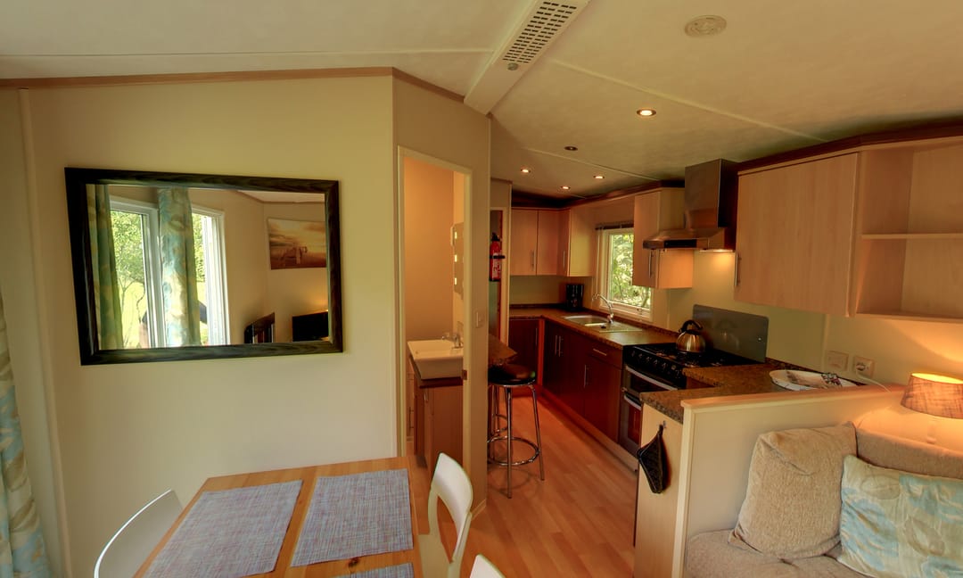 Bij binnenkomst is er een lange gang die leidt naar een keuken met keukenblokje. Daarnaast is er ruimte voor een tafel met stoelen en een zithoek.