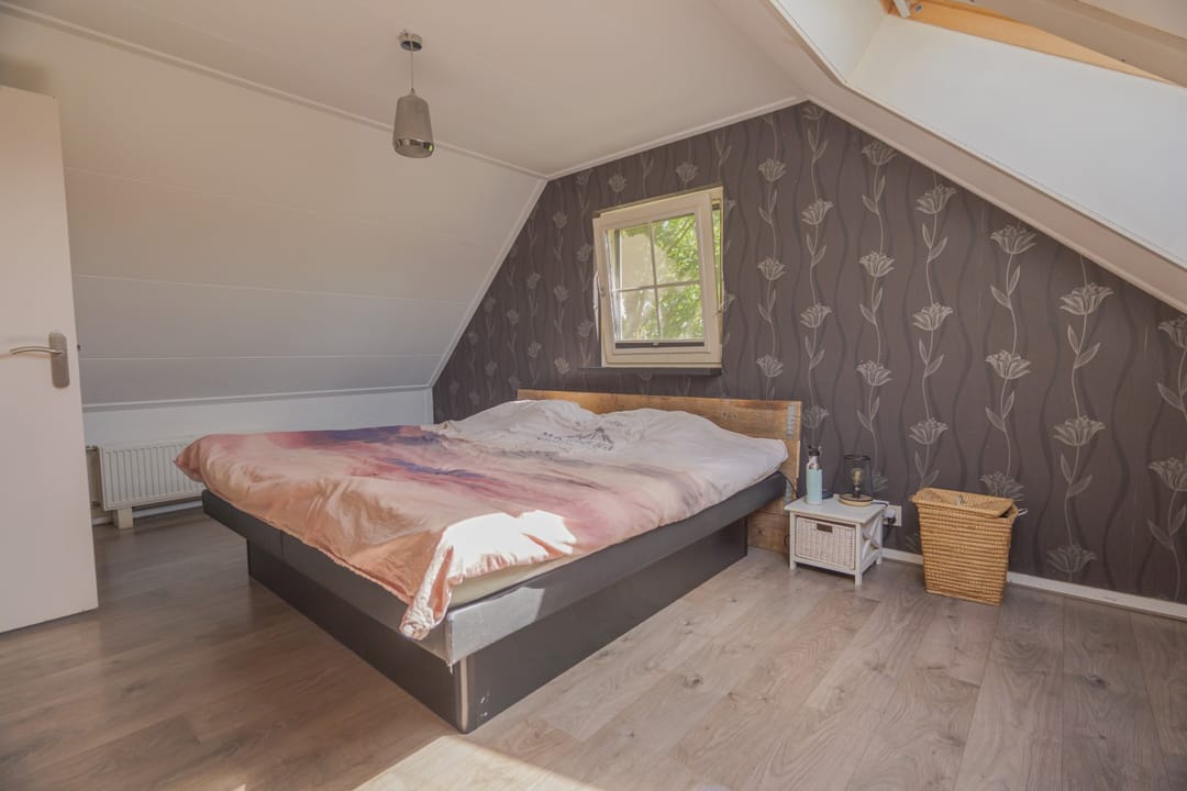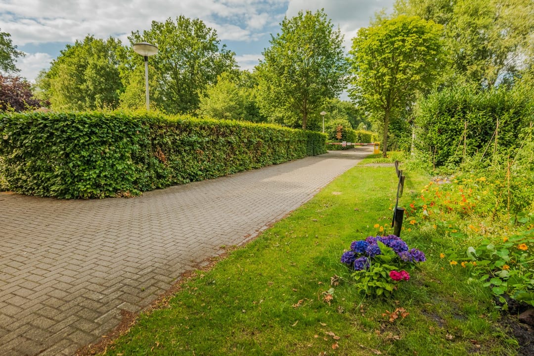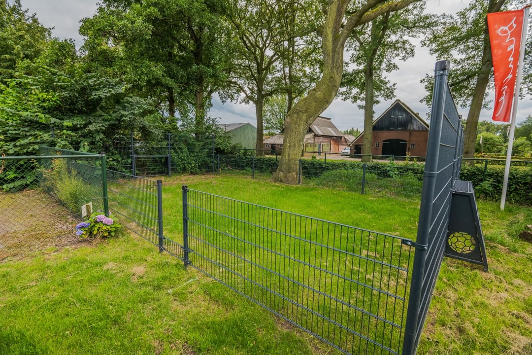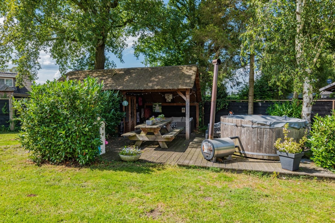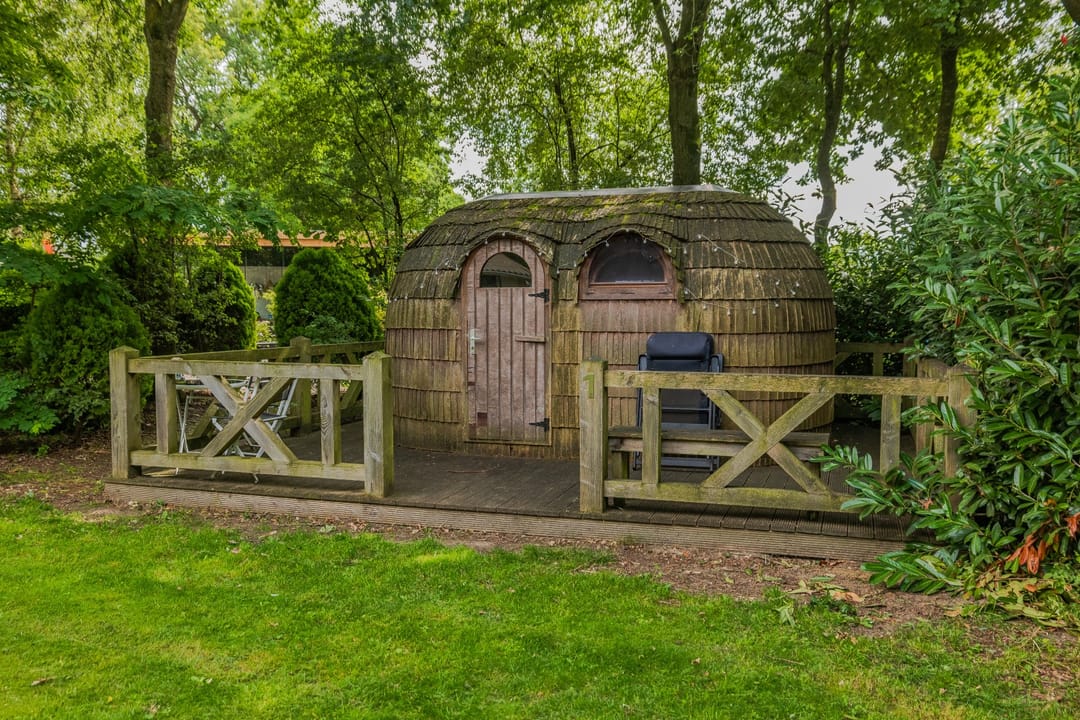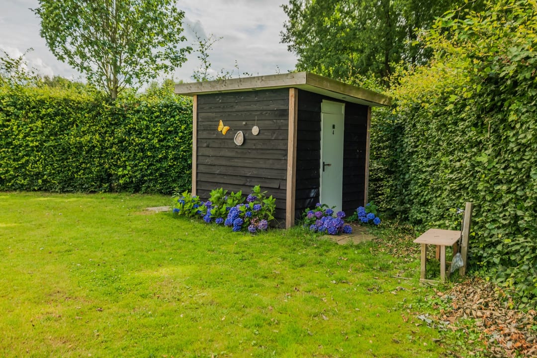 Aan de bedrijfswoning is een schuur met afdak gebouwd, in de omliggende diepe tuin is een tuinhuis met hottub geplaatst.