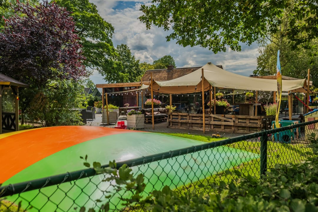 Grenzend aan het terras zijn een airtrampoline, een zandbak en een pannakooi.