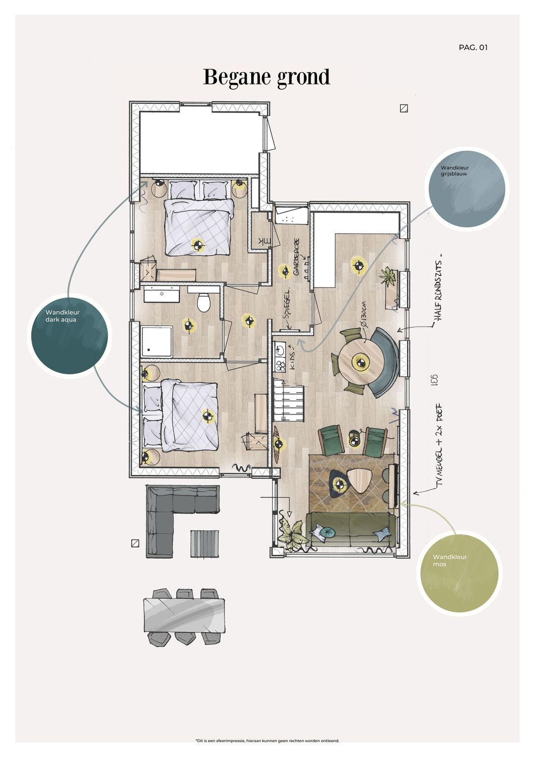 Om een indruk te geven van de mogelijkheden qua inrichting en afwerking, zijn er foto's gebruikt van een vergelijkbare, reeds ingerichte woning (nr 114).
