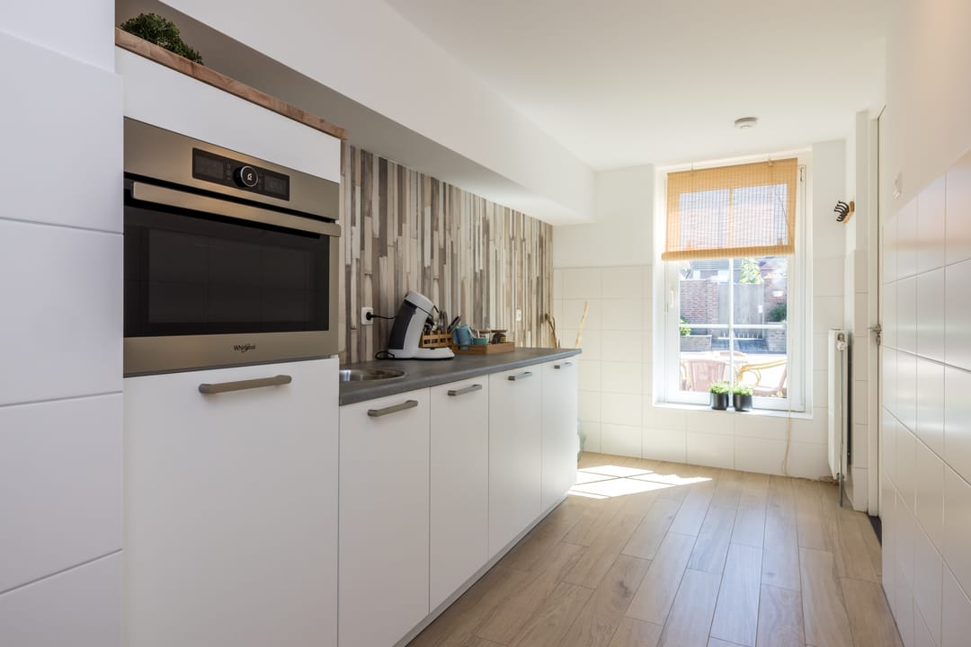De bijkeuken biedt ruimte voor een gastentoilet en is voorzien van een wasmachineaansluiting. Onder de bijkeuken bevindt zich de kelder.