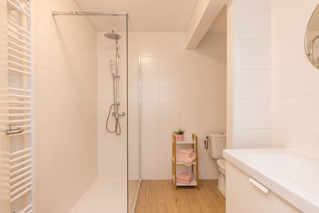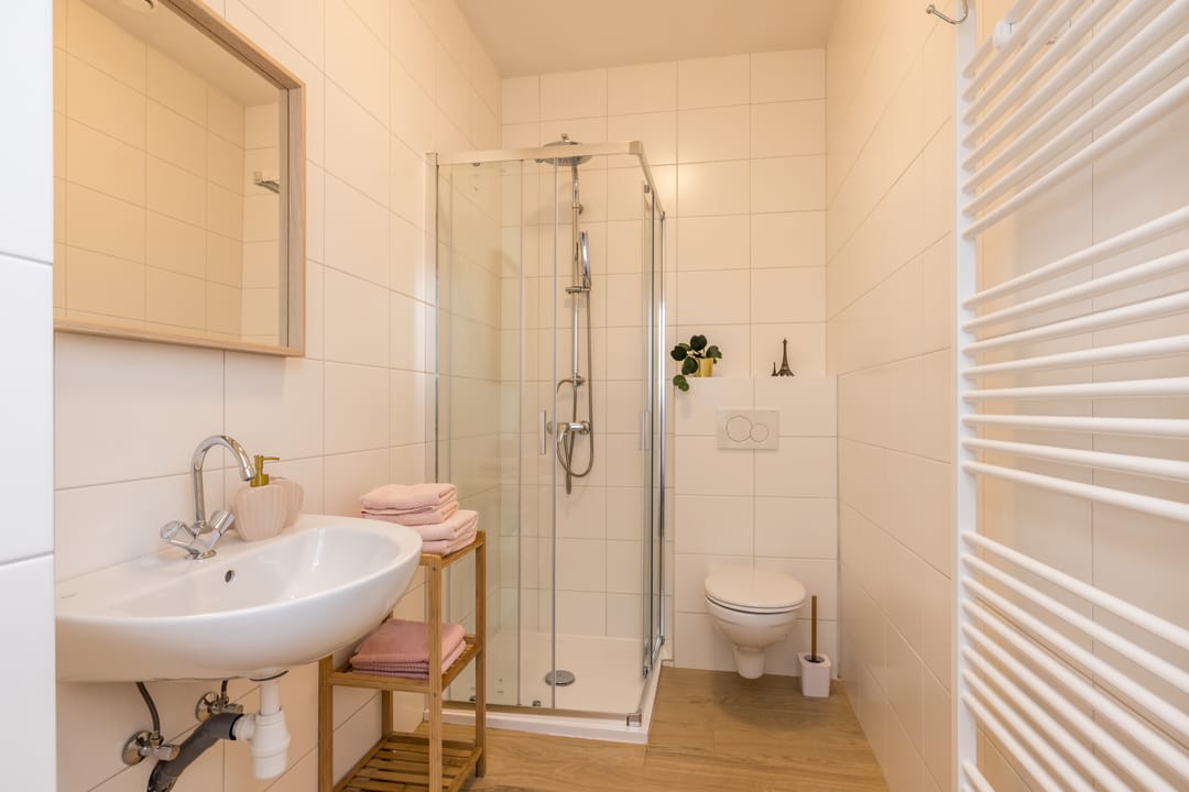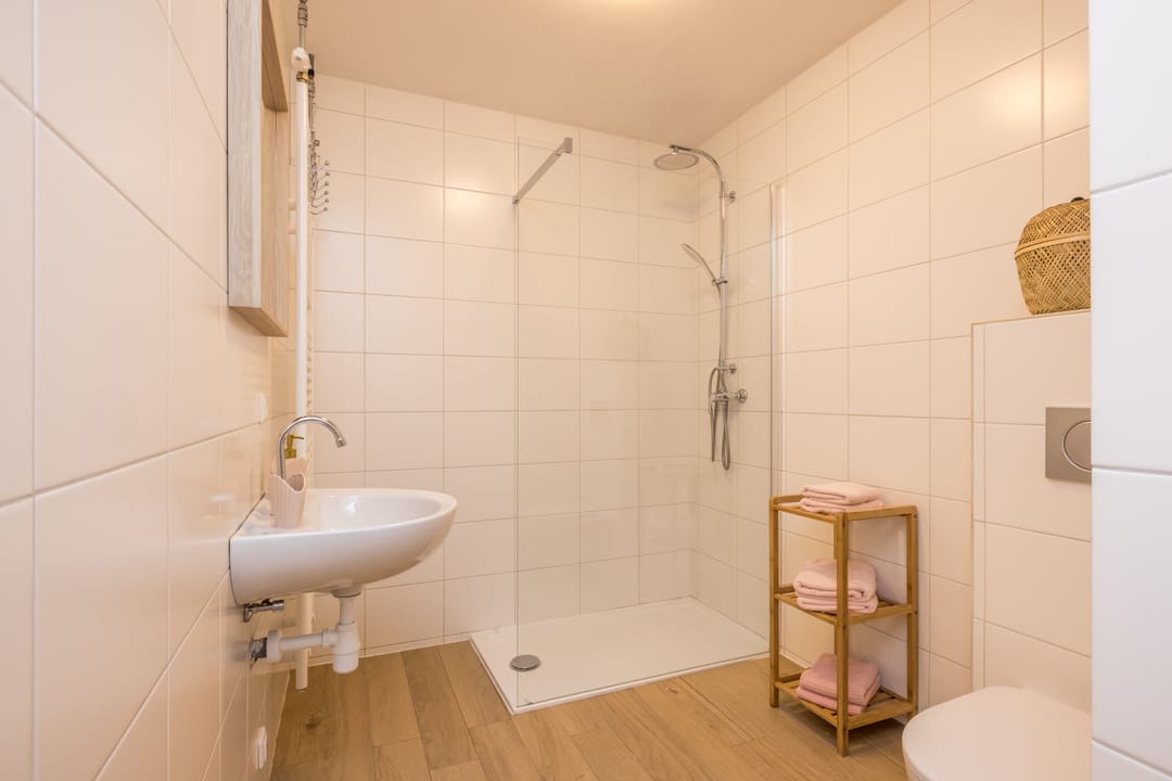 Gastenverblijf 1, beschikt over een slaapkamer met zij ingang, pantry, badkamer met toilet, inloopdouche en wastafel.