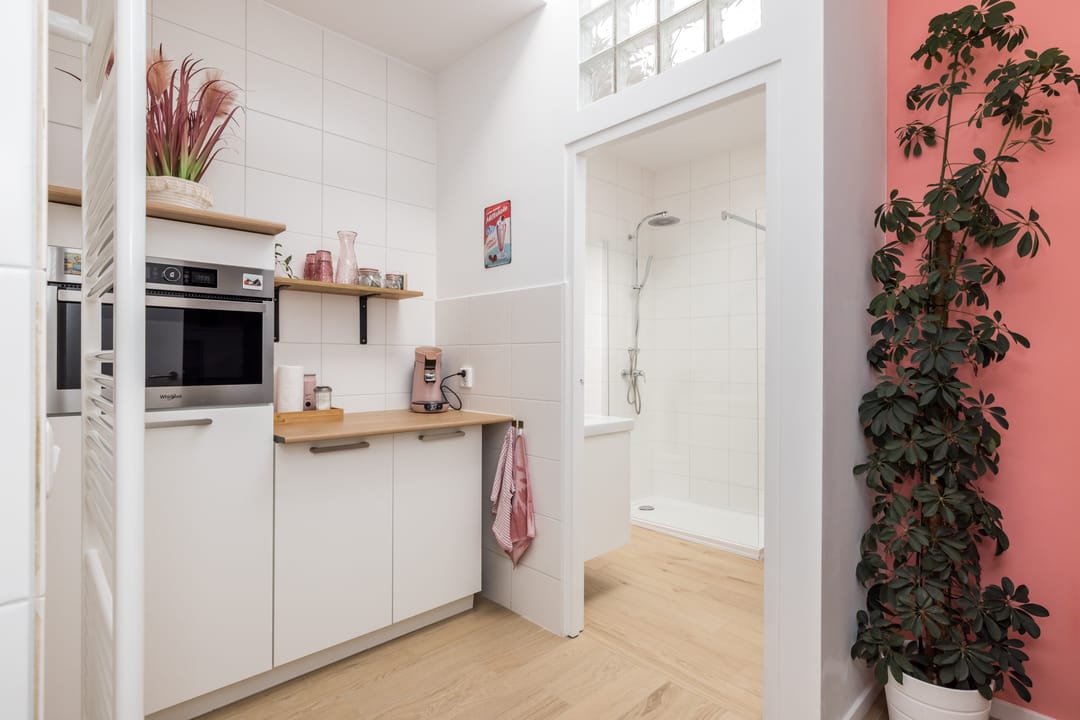 Gastenverblijf 4, beschikt eveneens over 2 slaapkamers en/of 1 slaapkamer en 1 woonkamer, een separate pantry met keukenblok en badkamer met inloopdouche, toilet en wastafel.