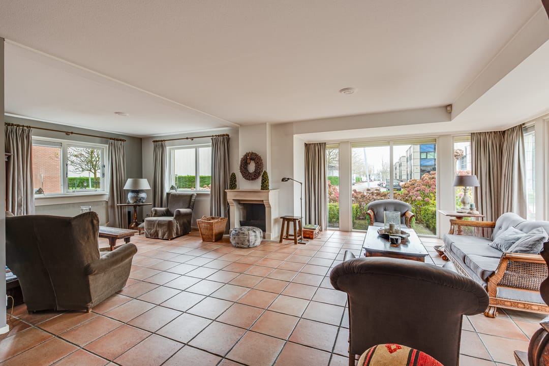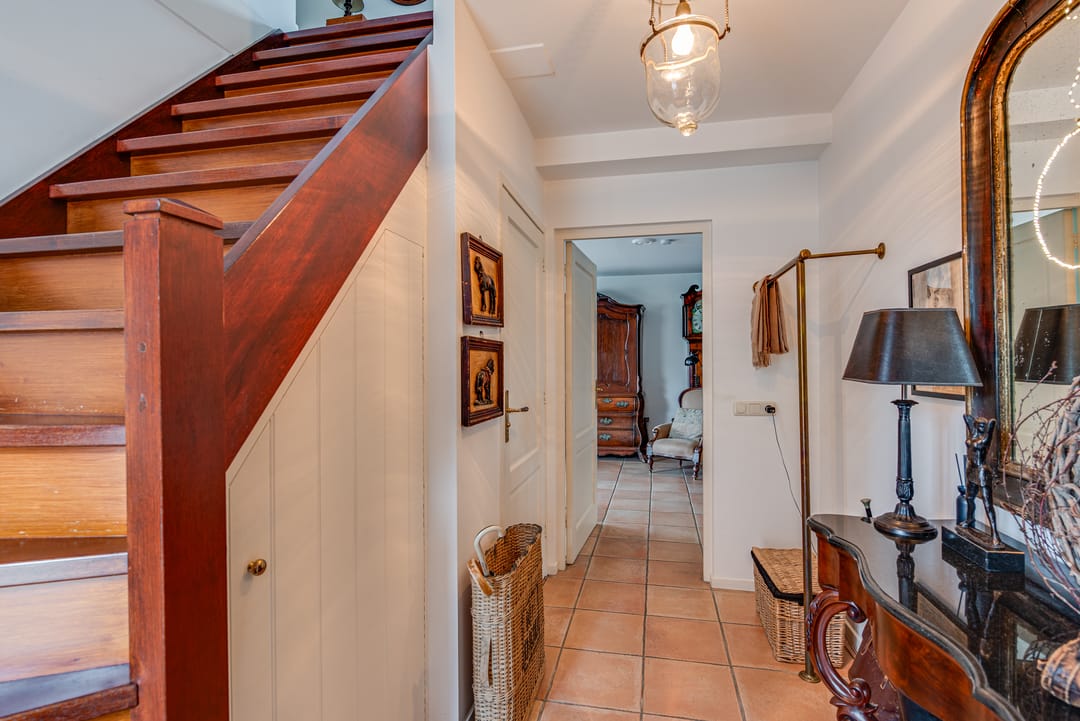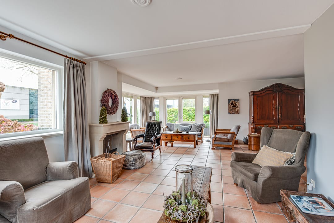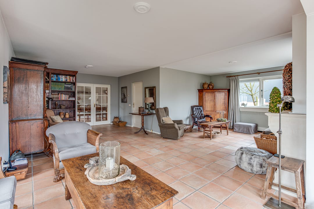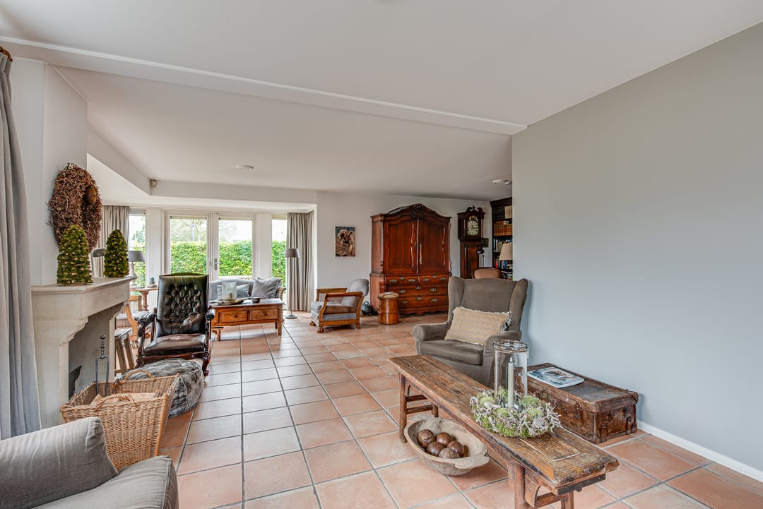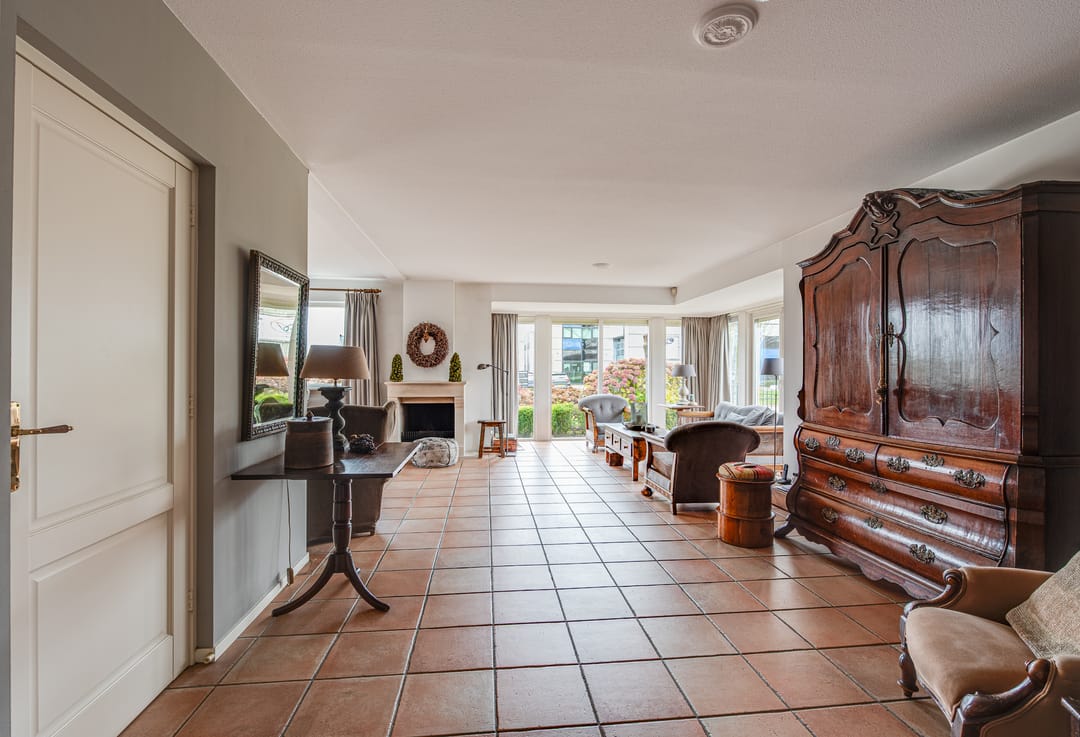 Entree, ruime hal, modern toilet, grote bergkast met aansluitingen voor wasmachine en droger, lichte royale woon-eetkamer met een grote serre, diverse openslaande deuren naar zonnige fraai aangelegde tuin met zonneterrassen.