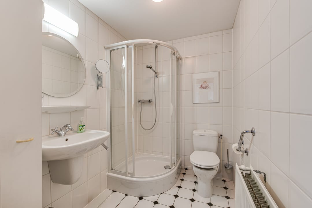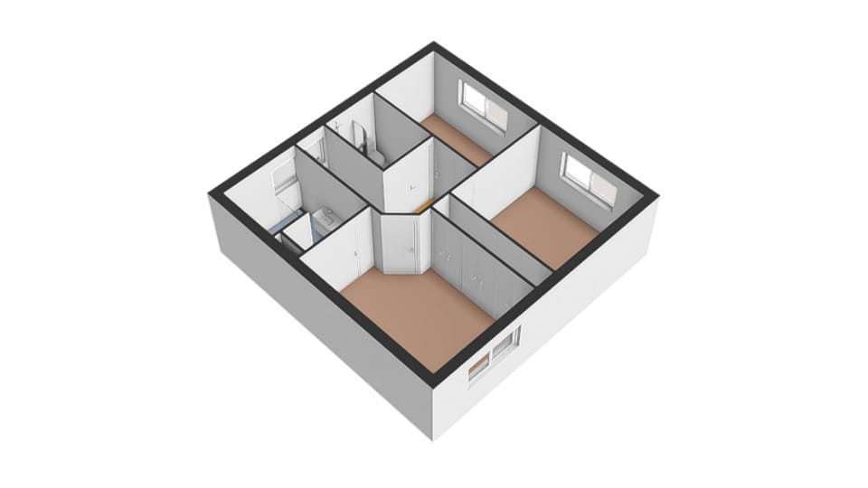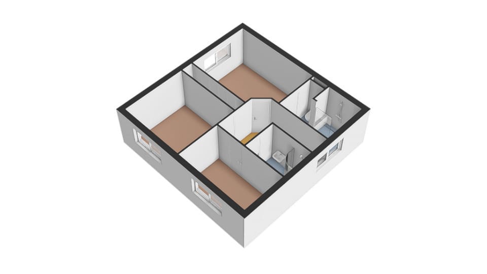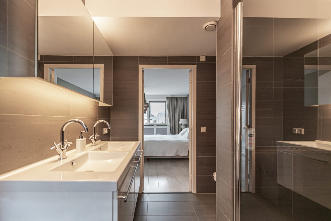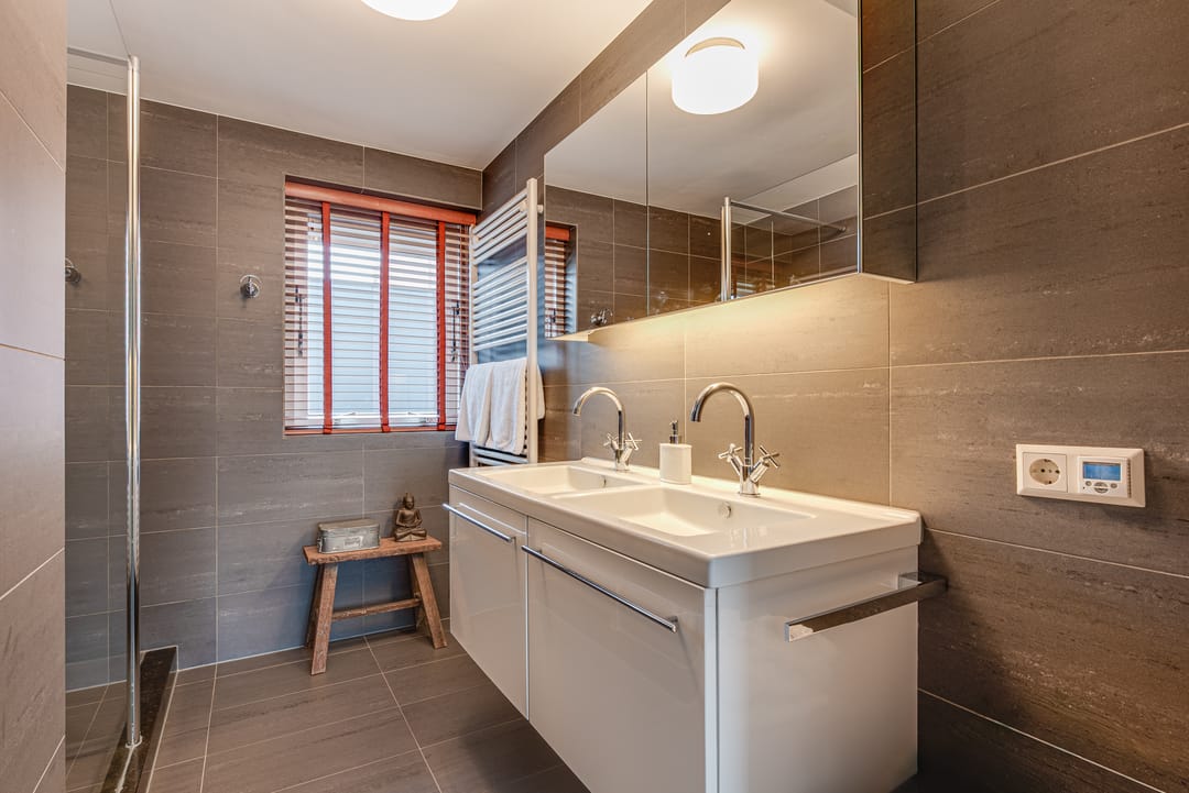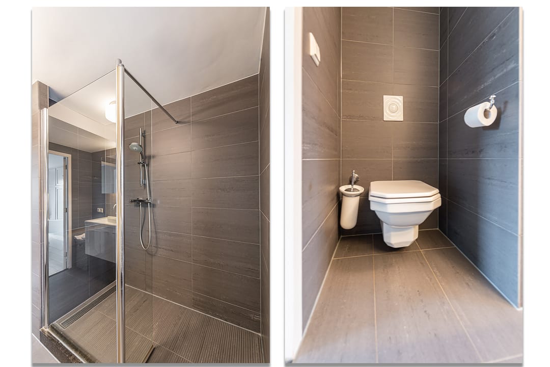 Verdieping: overloop, 2 grote slaapkamers waarvan 1 met grote kastenwand, 1e moderne badkamer met inloopdouche, 2e toilet en wastafelmeubel. 2e badkamer met douche, 3e toilet en wastafel, 3e kleinere slaapkamer.
