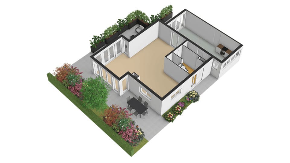 Garage aan de zijkant is bereikbaar via een zeer brede electrische garagedeur.
