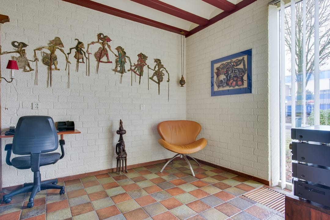 Aan de voorzijde van de woonkamer bevindt zich een multifunctionele werkkamer met een mooi uitzicht over de voortuin, ideaal als thuiswerkplek, kantoor of hobbyruimte.