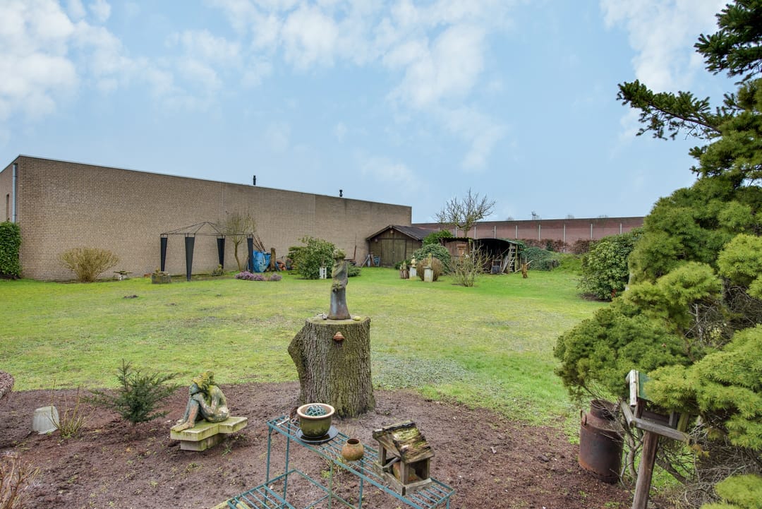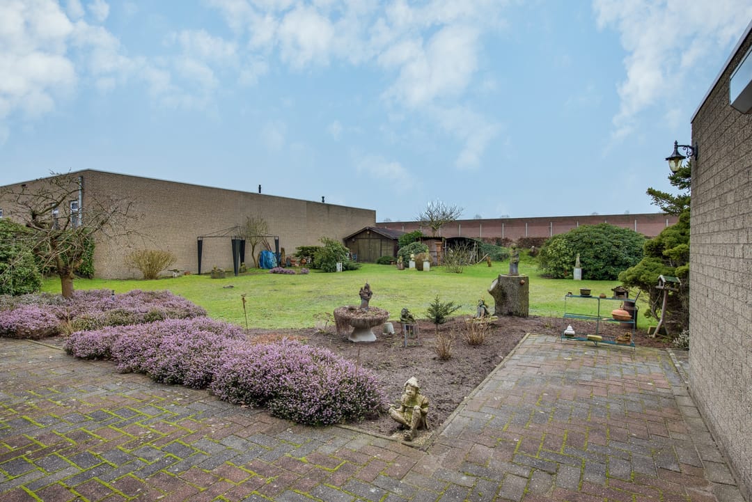 Direct grenzend aan de bedrijfswoning bevinden zich ruime terrassen met sierbestrating, waardoor een prettige overgang ontstaat tussen binnen en buiten. Vanuit hier kijkt u uit over de diepe achtertuin met gazon, volwassen beplanting, sierheesters en diverse groene borders. De tuin is rondom voorzien van hagen en groenstructuren die zorgen voor beschutting en een aangename mate van privacy.
