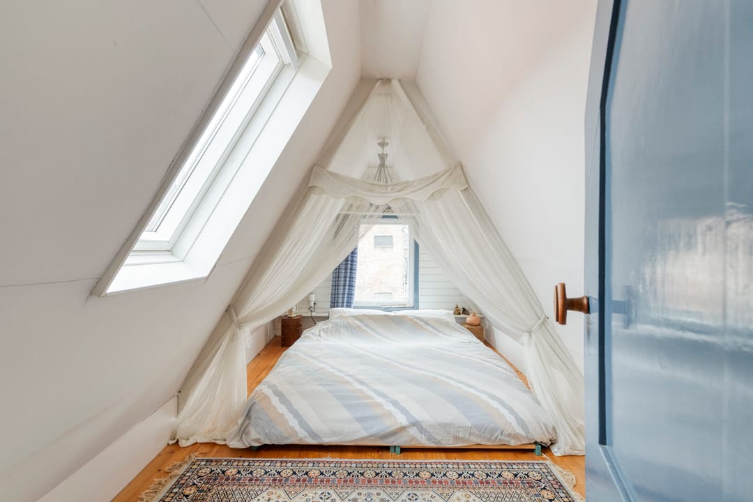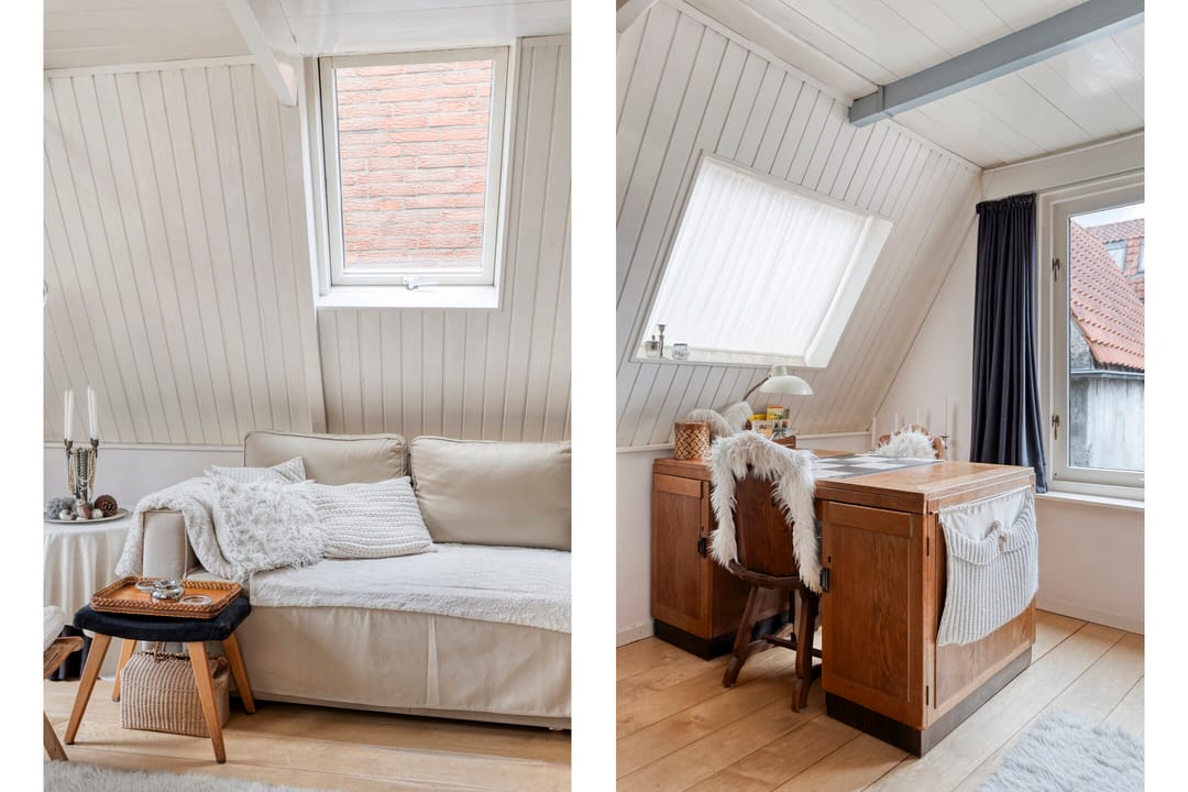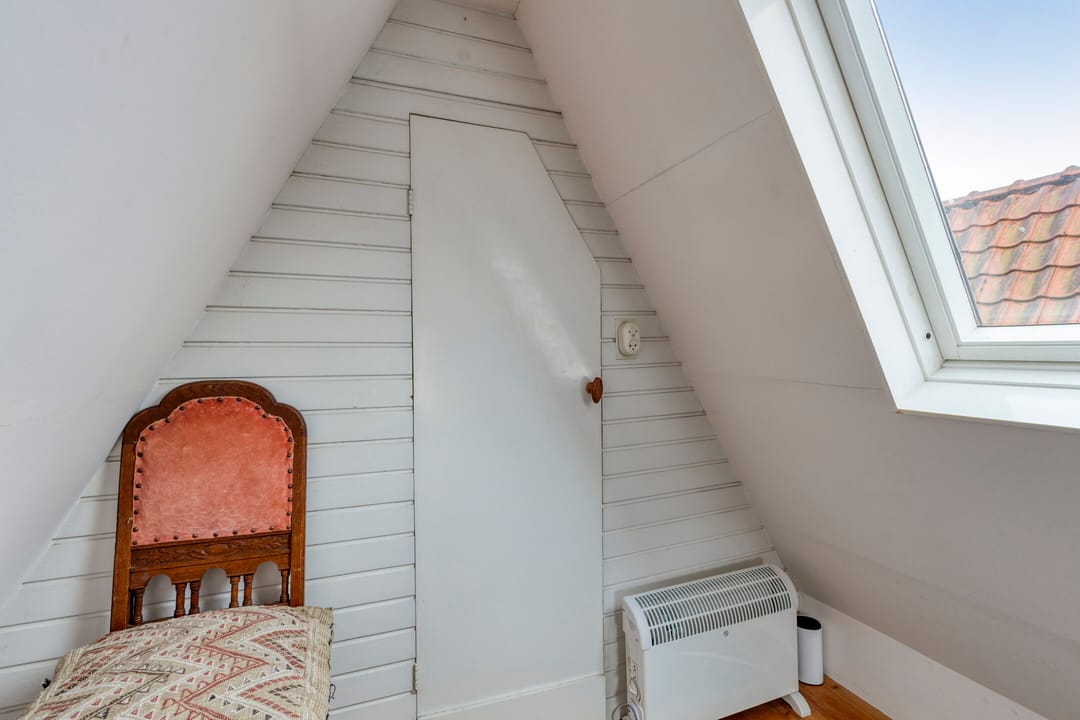De tweede verdieping is een knus hoogtepunt. Hier vind je twee charmante kamers onder het puntdak, waar een warme sfeer gecreëerd wordt door de speelse lijnen van het dak en het romantische uitzicht. Stel je voor: een kinderkamer vol fantasie, een serene logeerkamer of een intieme werkruimte met voldoende daglicht. De mogelijkheden zijn eindeloos.