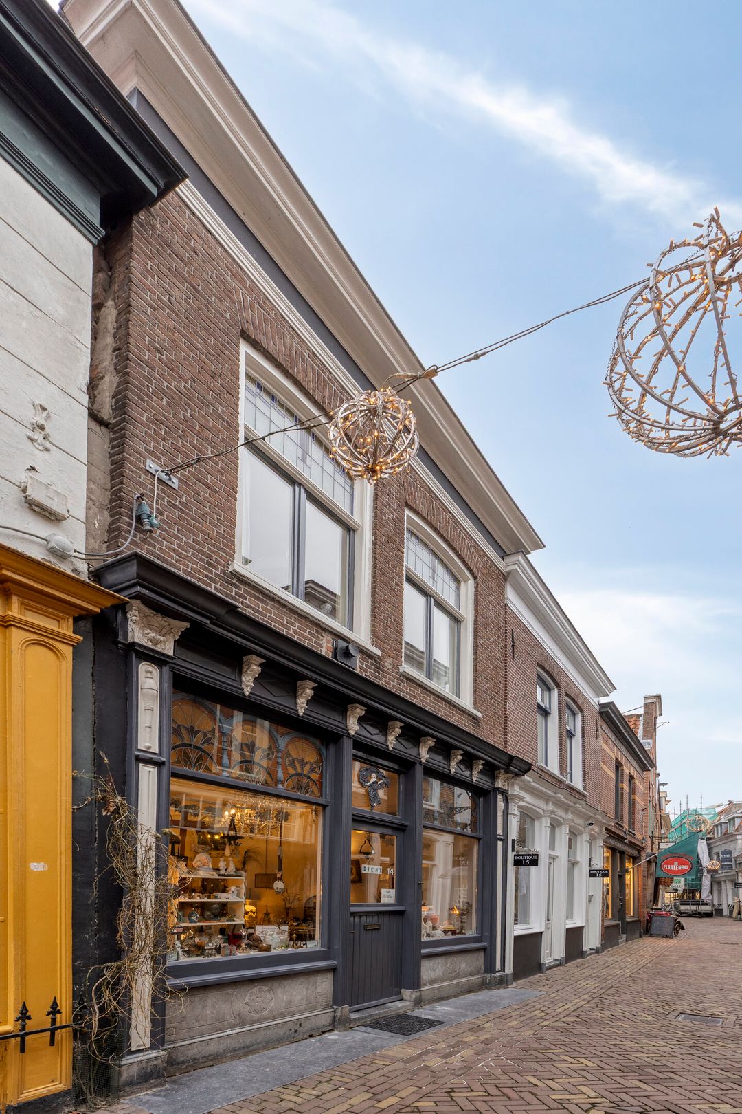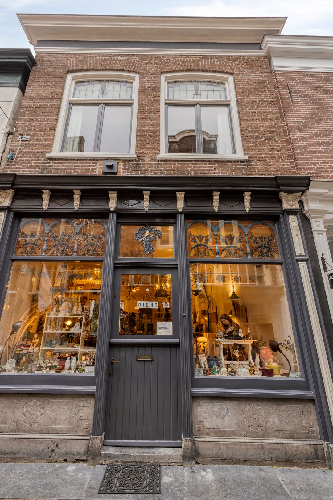 De winkelpui heeft een symmetrische, negentiende-eeuwse opzet met pilasters, kapitelen en een geprofileerde kroonlijst. Opvallend zijn de Jugendstilelementen rond 1900, zoals sierlijke blad- en bloemmotieven in houtwerk en glas-in-lood. Boven de middendeur staat een afbeelding van Fortuna, passend bij de geschiedenis: rond 1962 ontsnapte het pand aan sloop vanwege plannen voor een dwars door de binnenstad lopende invalsweg. Later werd Hekelstraat 14, samen met vier buurpanden, aangewezen als gemeentelijk monument.