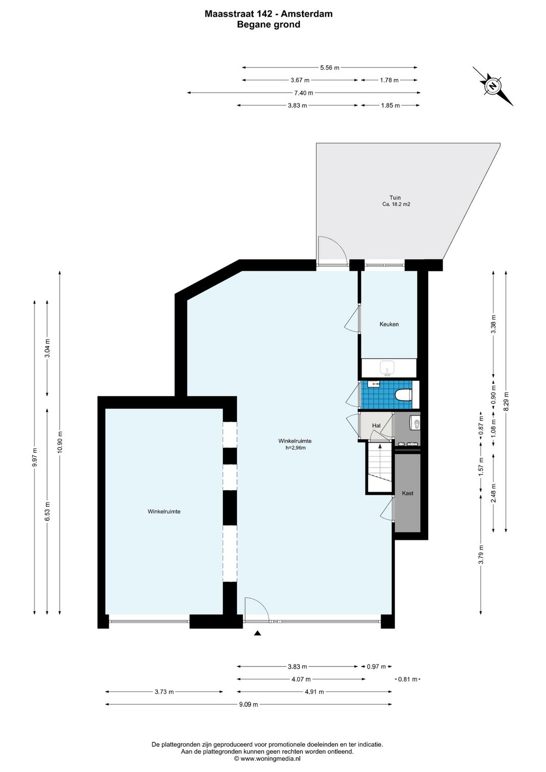 Het winkelfront beschikt over 2 grote etalageruiten en meet ruim 9.00 meter breed.