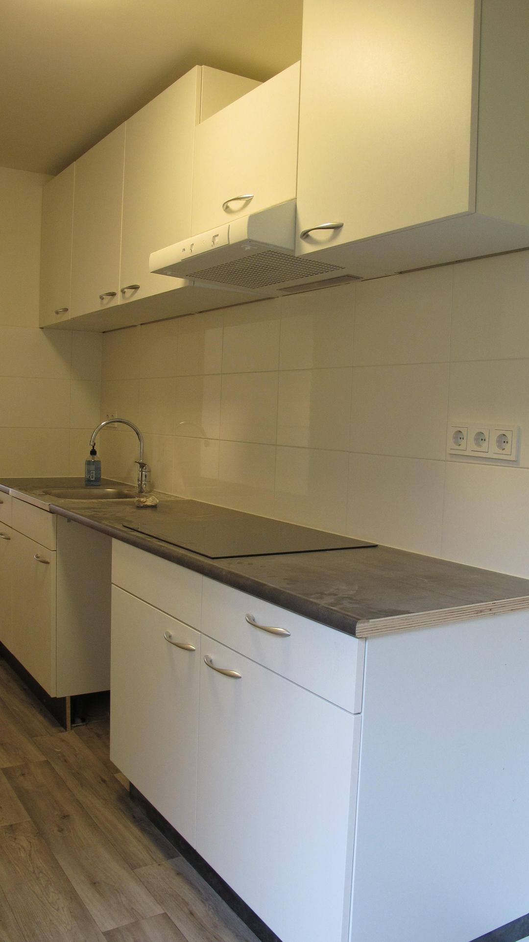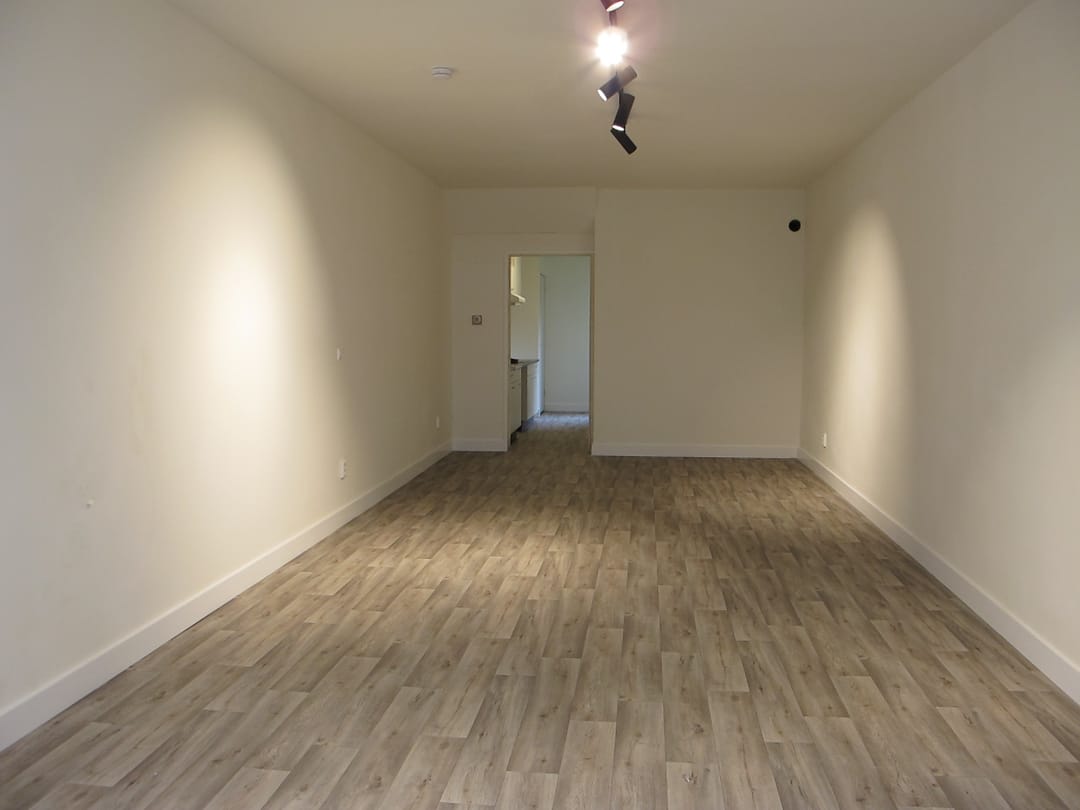 Verkoopruimte voorzijde, hal met keuken, toegang naar WC en bandkamer.