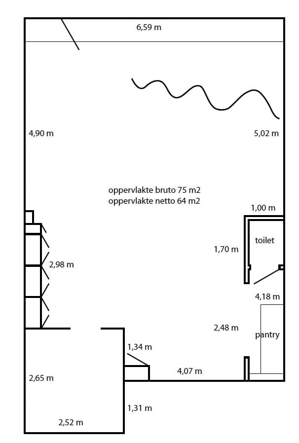Gelegen op de begane grond, met een oppervlakte van 75 m2 met opvallend hoge plafonds van 3,70 meter, en een ruime en lichte etalage van 6,60 meter, over de hele breedte van het pand.