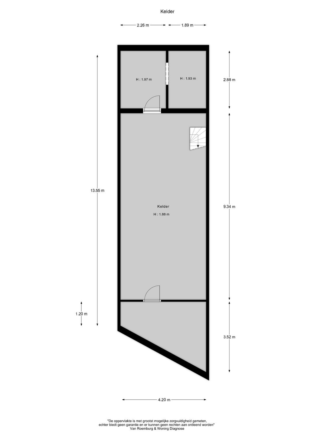 De kelder heeft een plafondhoogte van 1,88 meter.