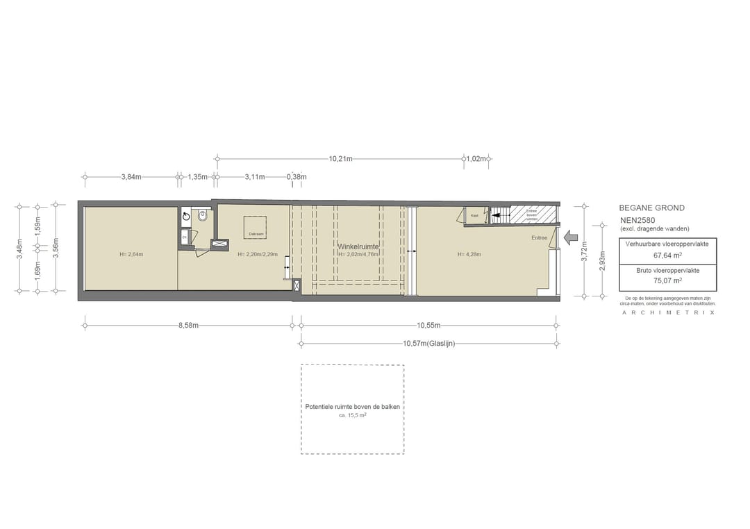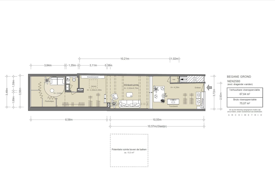 Het hoge plafond, de grote raampartijen en de karakteristieke historische details geven het gevoel van een eigen oase midden in de stad. Het hoge etalageplafond aan de voorzijde biedt de ideale mogelijkheid voor winkeliers om hier hun sfeer en producten te presenteren. Mede dankzij de authentieke balken is het tevens mogelijk in de ruimte een entresolverdieping te realiseren van circa 15 m² VVO. Kortom, de perfecte plek voor een ondernemer in een van de meest bruisende straten van Amsterdam.