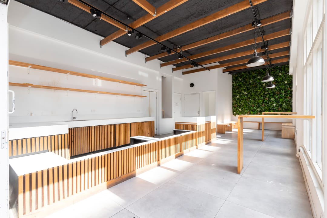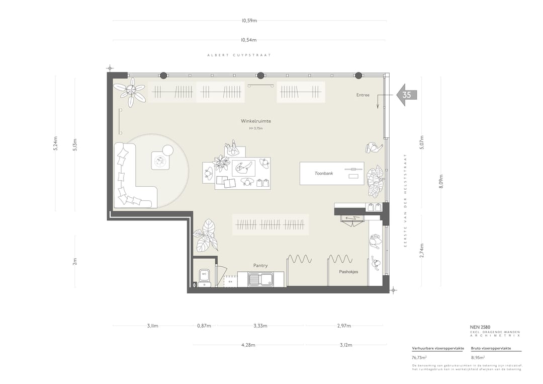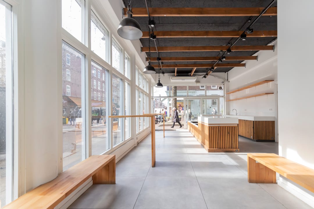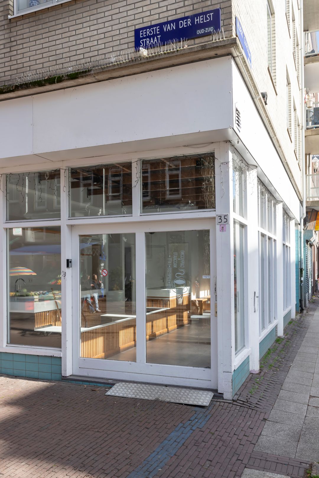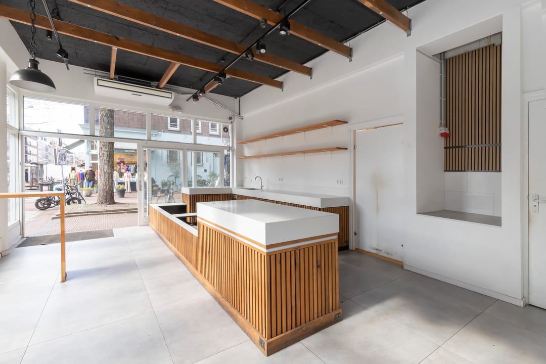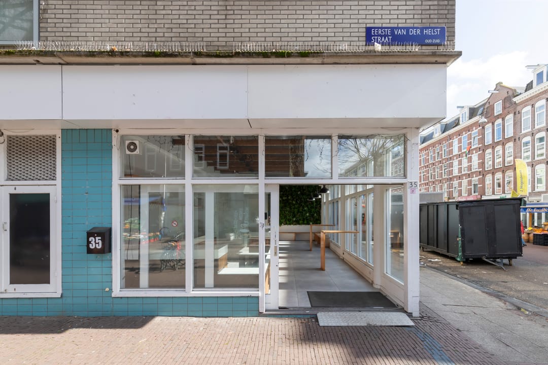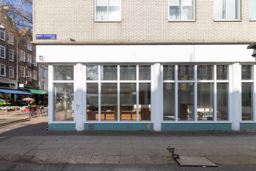 Op de hoek van de Eerste van der Helststraat en de Albert Cuypstraat wordt een winkelruimte te koop aangeboden. De winkelruimte maakt onderdeel uit van een commerciële plint onder een woongebouw. De metrage van de ruimte is circa 76 m² VVO en de vrije hoogte is 3,75 meter. Uniek aan de ruimte is de glazen frontbreedte van maar liefst 10 meter aan de zijde van de Albert Cuypstraat en 5 meter aan de zijde van de Eerste van der Helststraat.