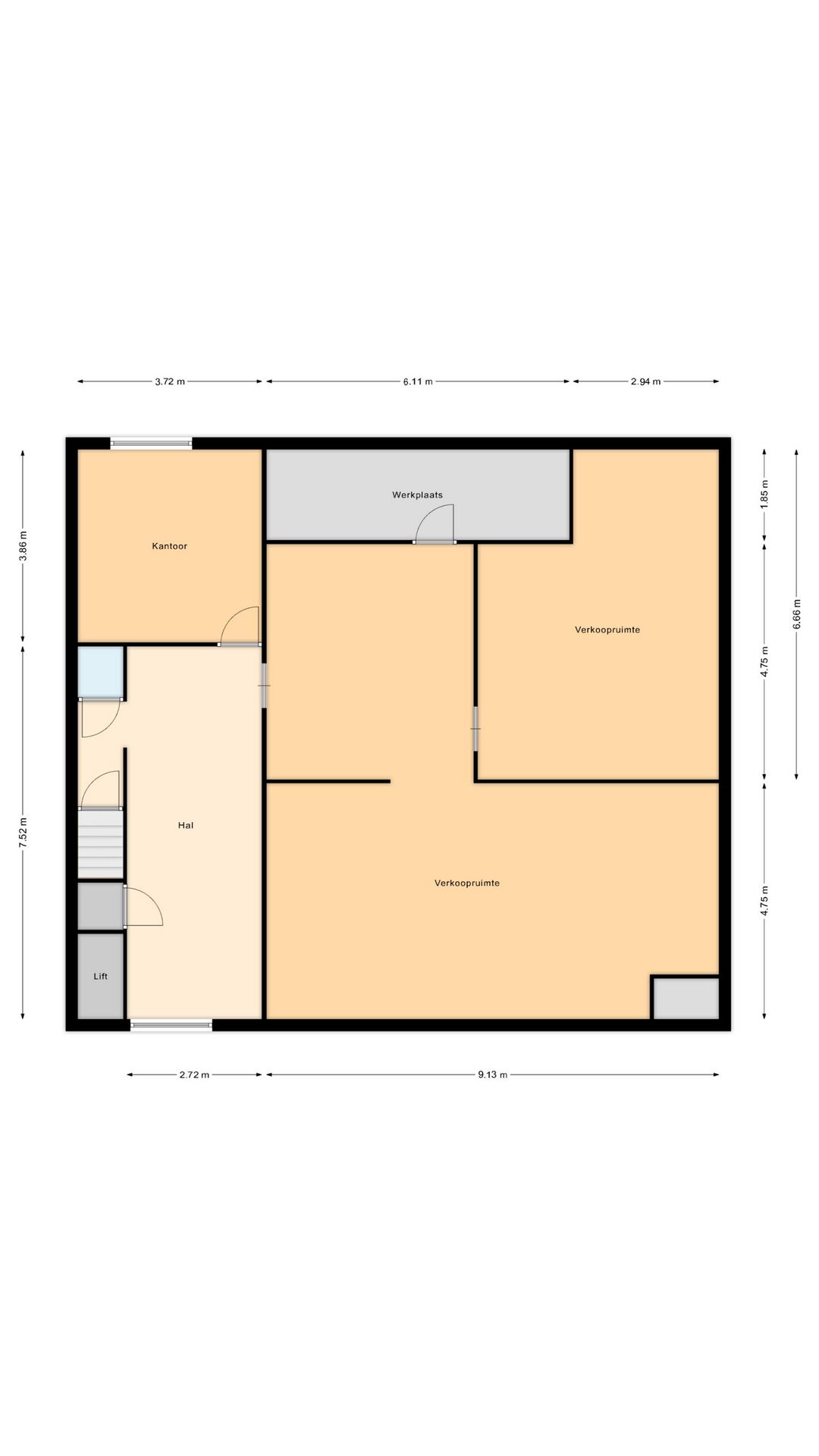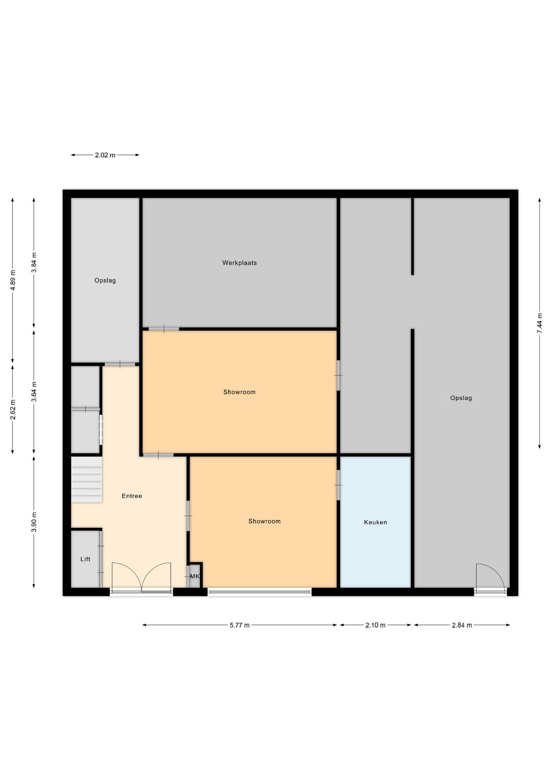 De commerciële ruimte heeft een totale vloeroppervlakte van ca. 246 m² verdeeld over de begane grond en eerste verdieping. De begane grond beschikt over een entree met aangrenzend een courante multifunctionele ruimte. Tevens beschikt de begane grond over opslagruimte welke middels een overheaddeur toegankelijk is. De eerste verdieping beschikt over diverse ruimtes.