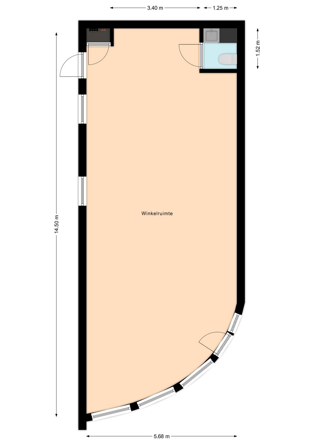 Aan de voorzijde de ingang met etalage. De grote raampartijen aan de voorzijde zorgen voor een goede lichtinval. Achterin de winkel bevindt zich een keukenblok, toilet en de meterkast. Ook is er een achteringang.