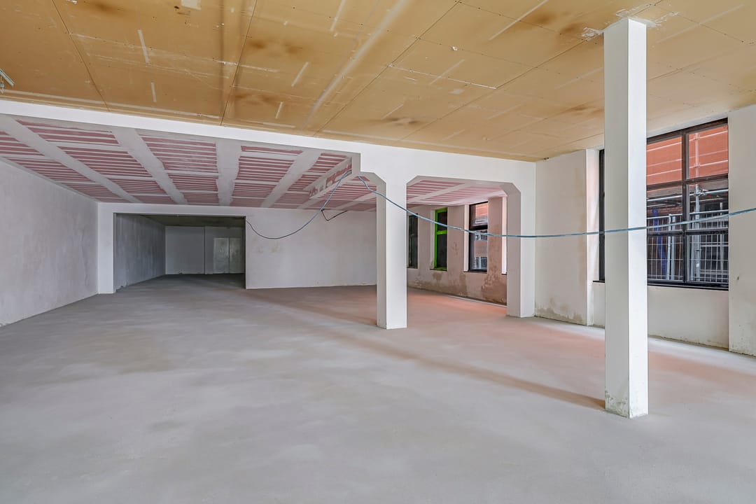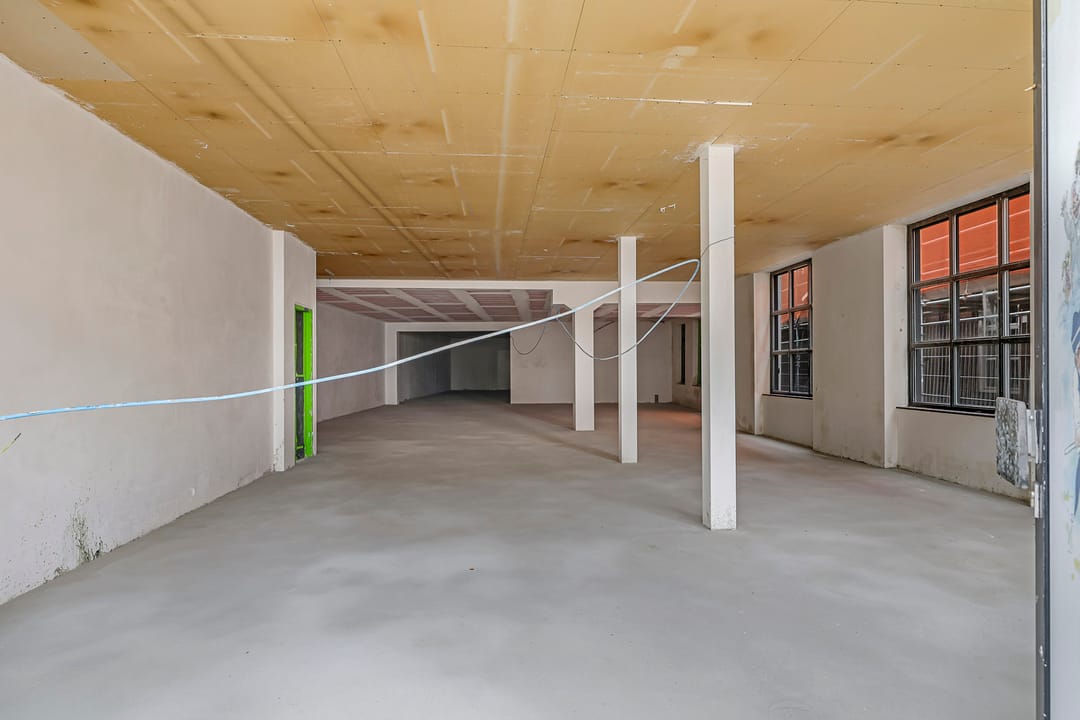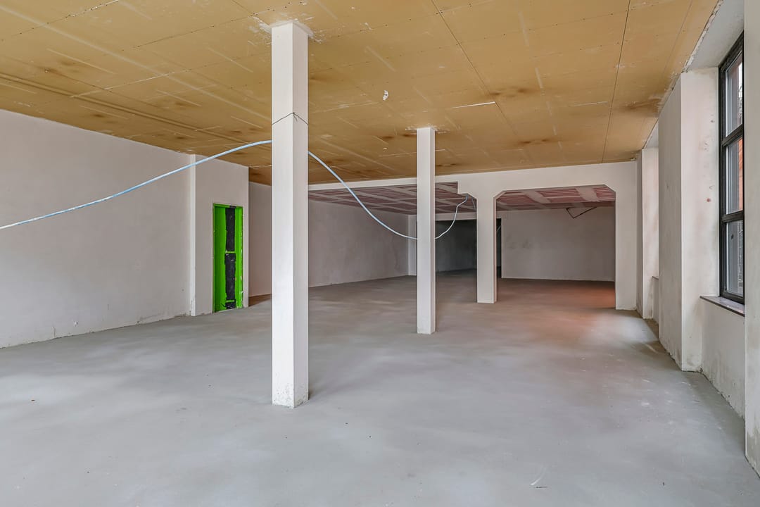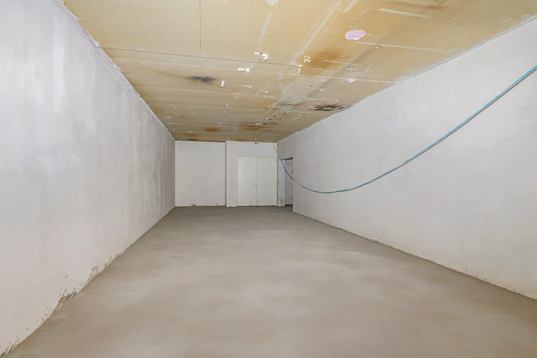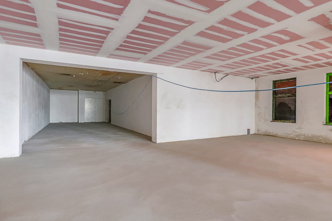 De ruimte is recent voorzien van een brandwerend plafond, de wanden zijn weer geheel glad gemaakt en er ligt een nieuwe cementdekvloer in.