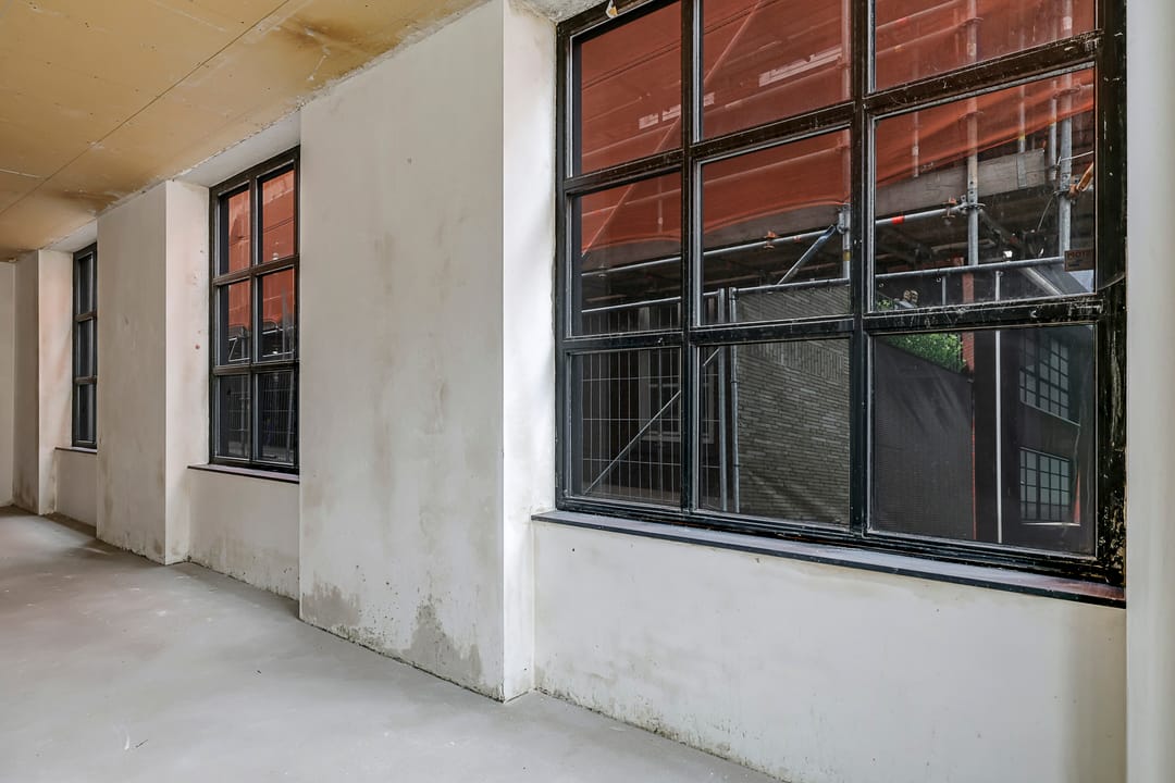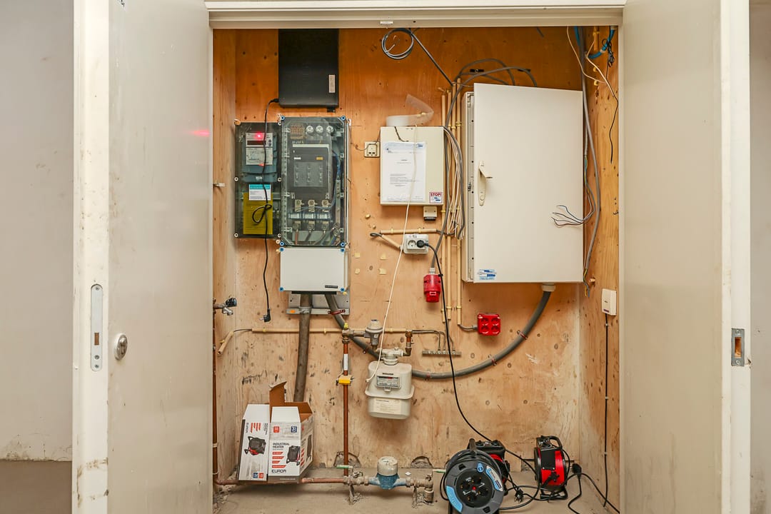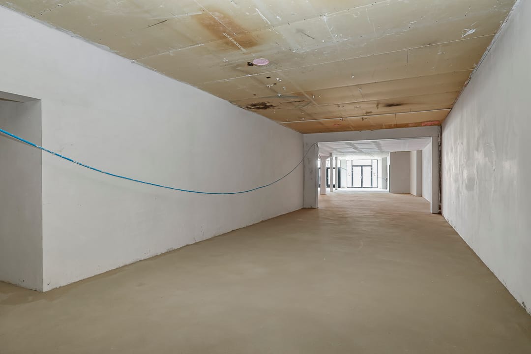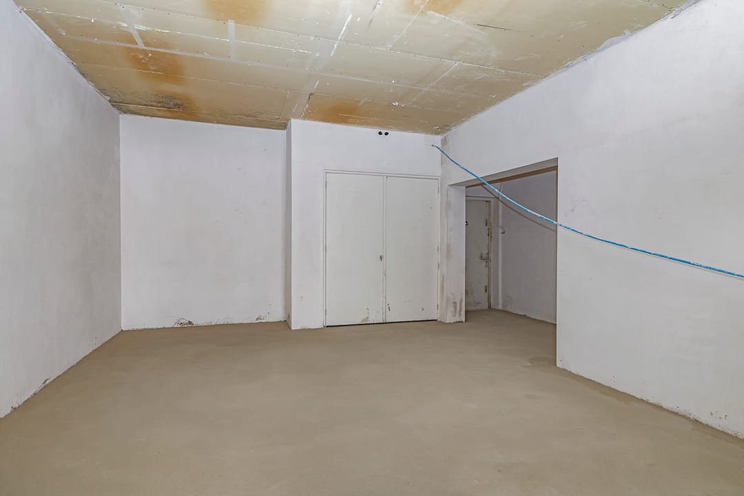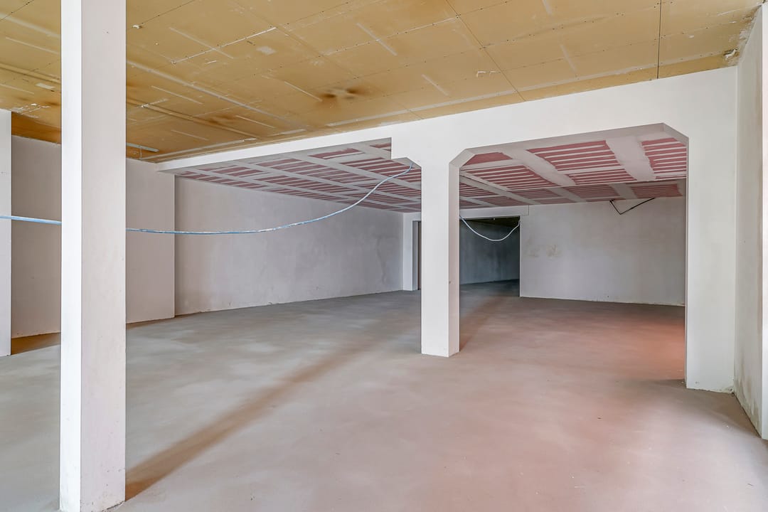 De ruimte is recent voorzien van een brandwerend plafond, de wanden zijn weer geheel glad gemaakt en er ligt een nieuwe cementdekvloer in.