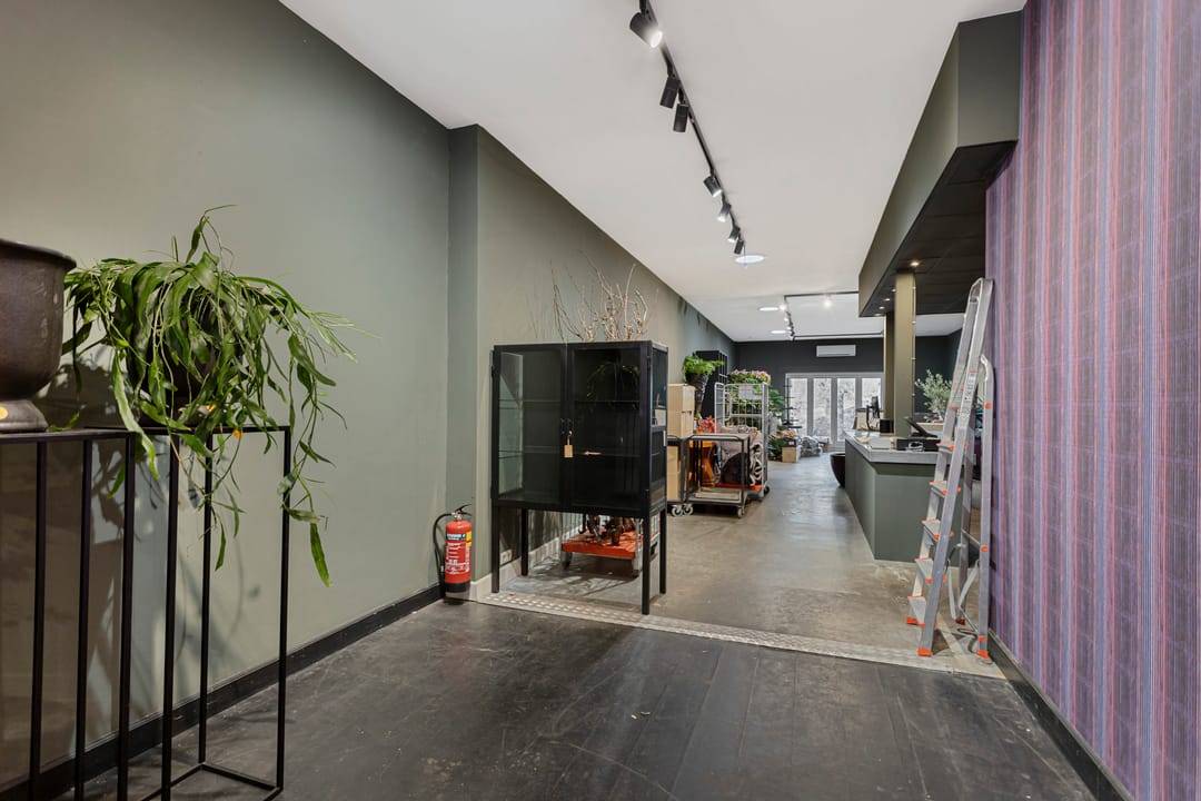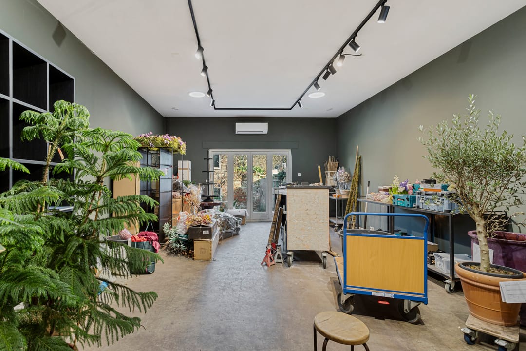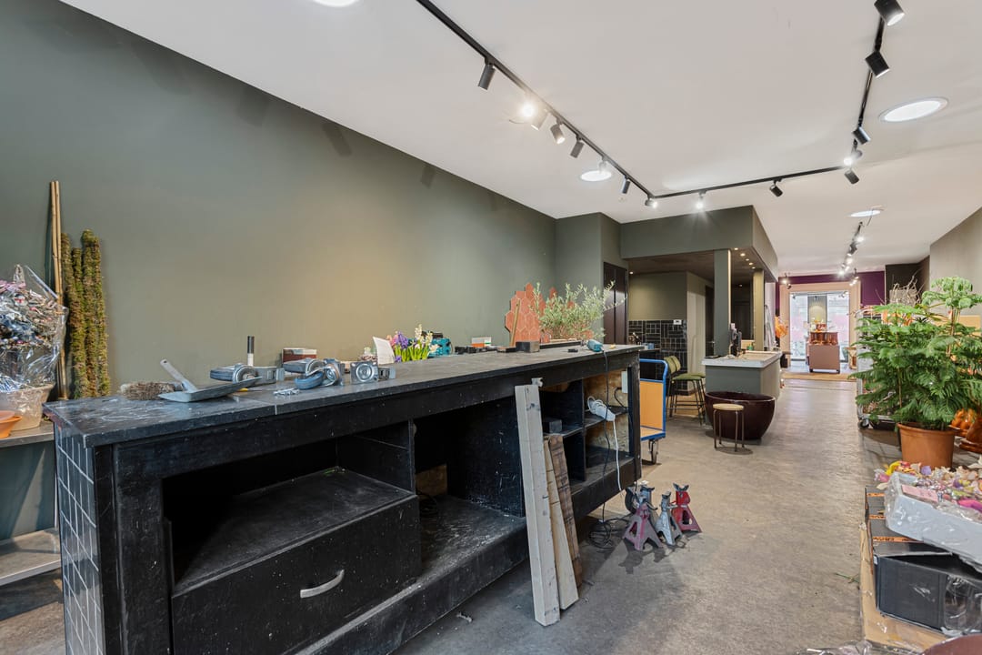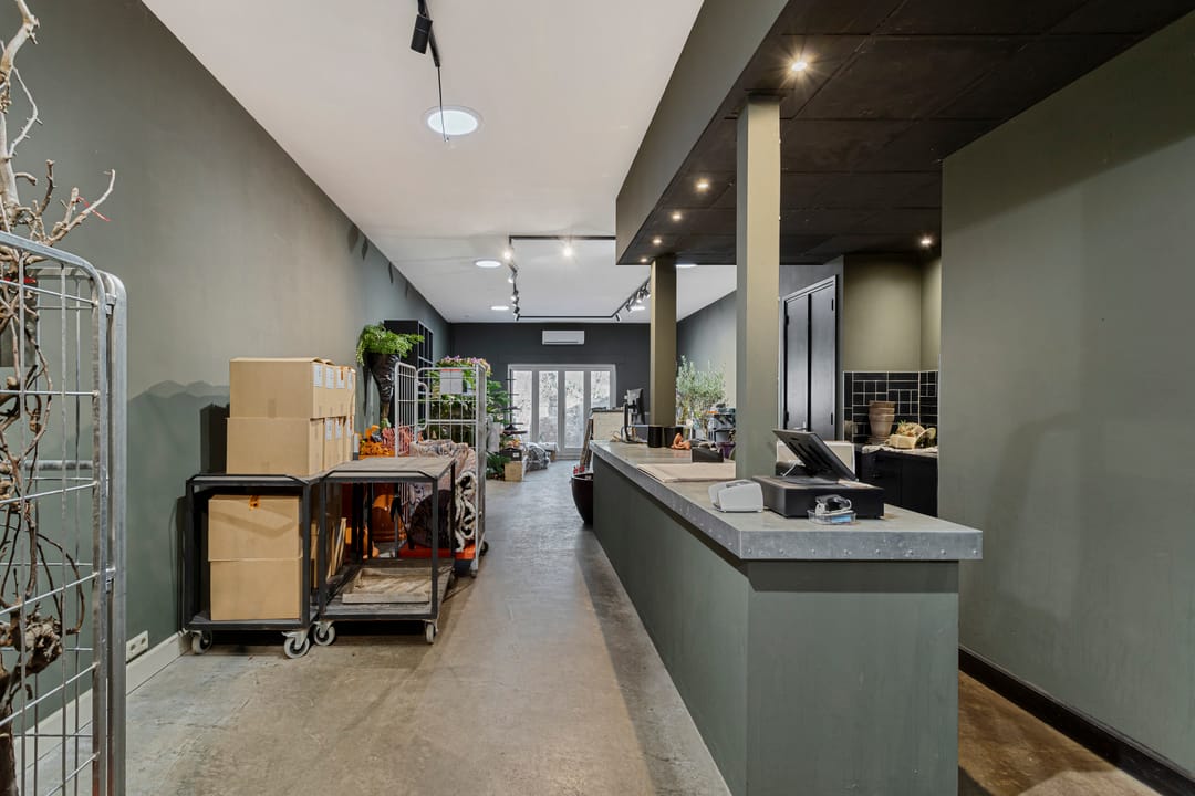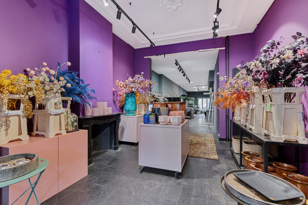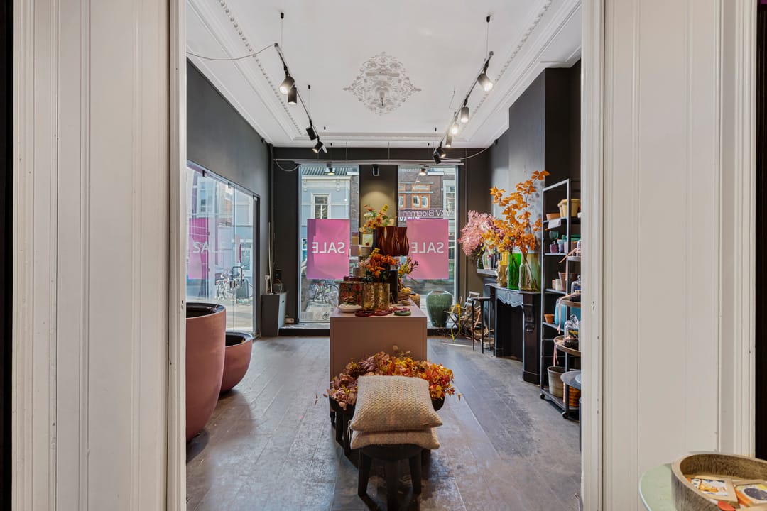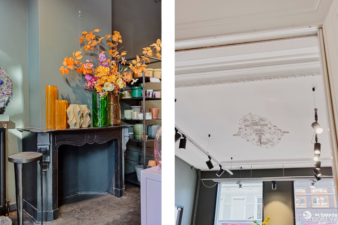 Te huur: een veelzijdige winkelruimte gecombineerd met kantoor, atelier of showroom, voorzien van een sfeervolle ruimte met klassieke gevel en een kleine buitenruimte / tuin.