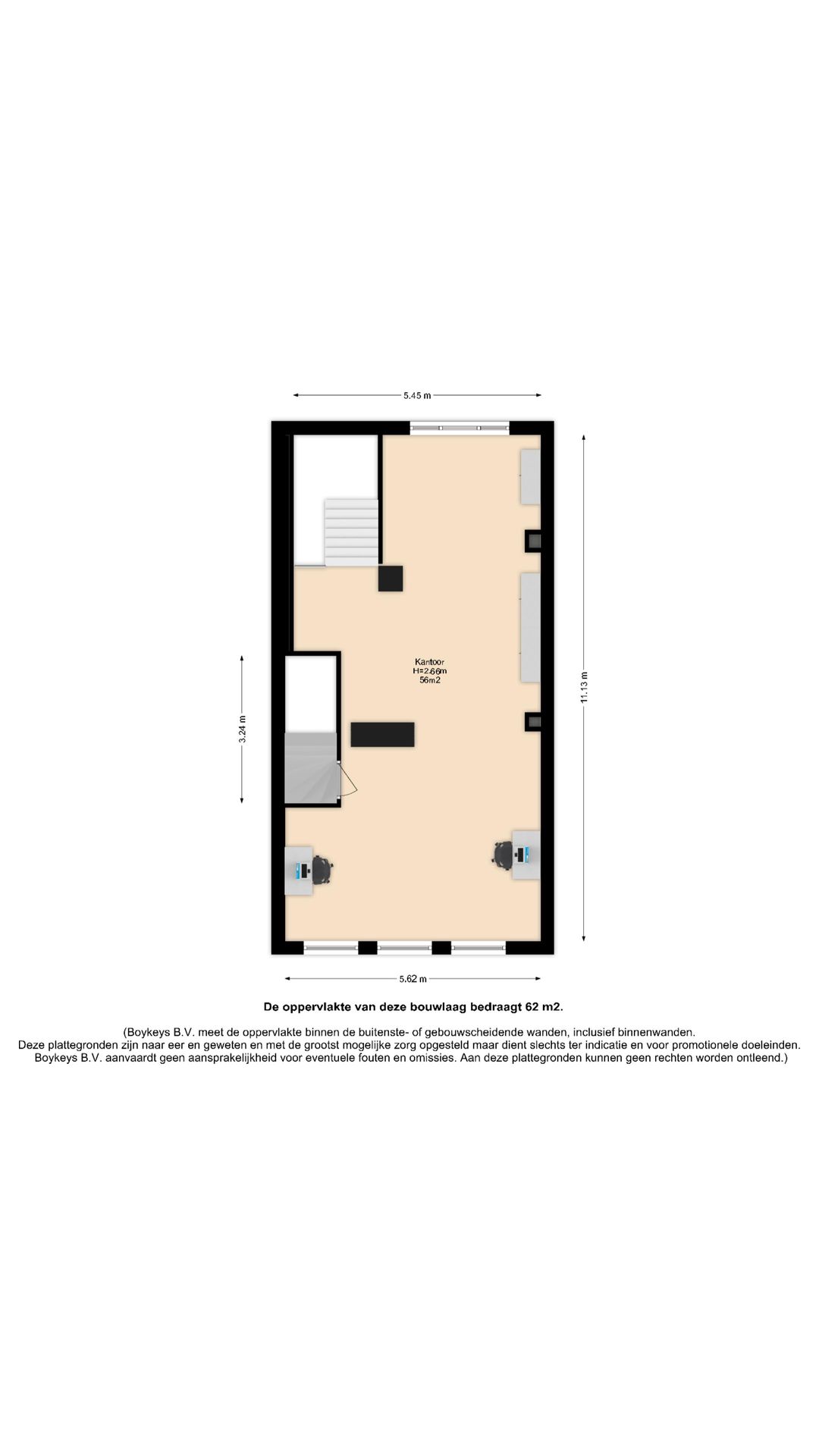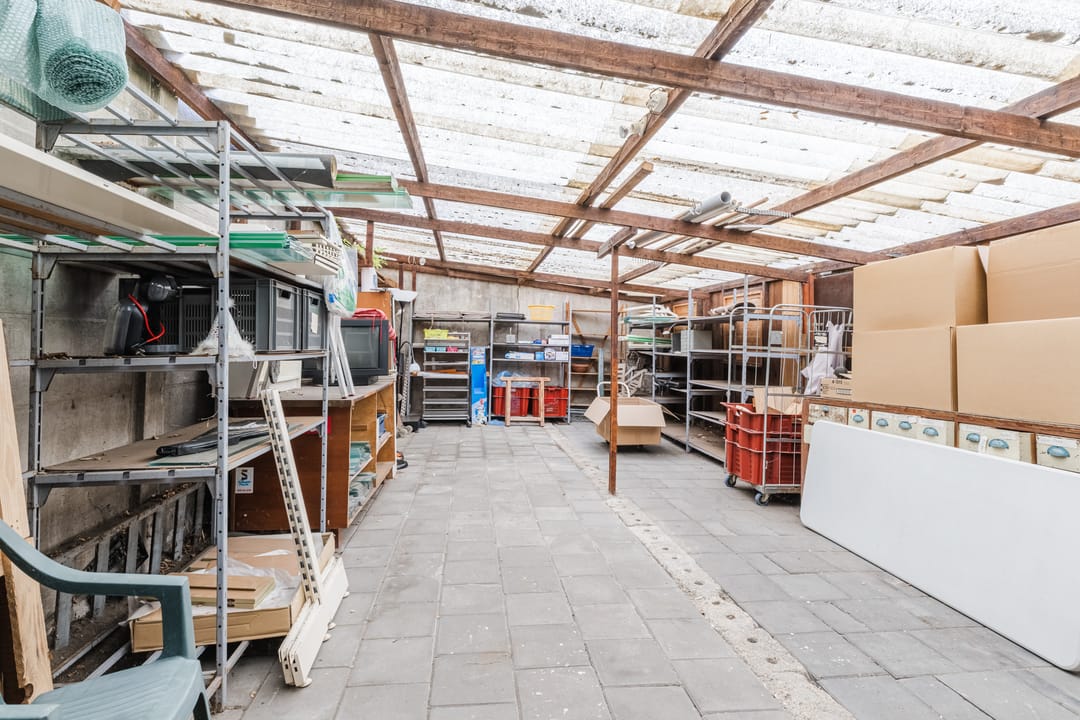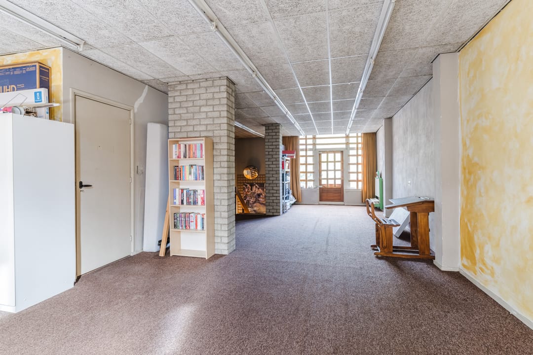Een vaste trap brengt je naar de eerste verdieping. Deze ruimte leent zich perfect als kantoor of personeelsruimte, maar kan ook als woonverdieping worden ingericht, bijvoorbeeld met een woonkamer, keuken en badkamer. Dankzij de ramen aan de voor- en achterzijde geniet je hier van natuurlijk lichtinval.