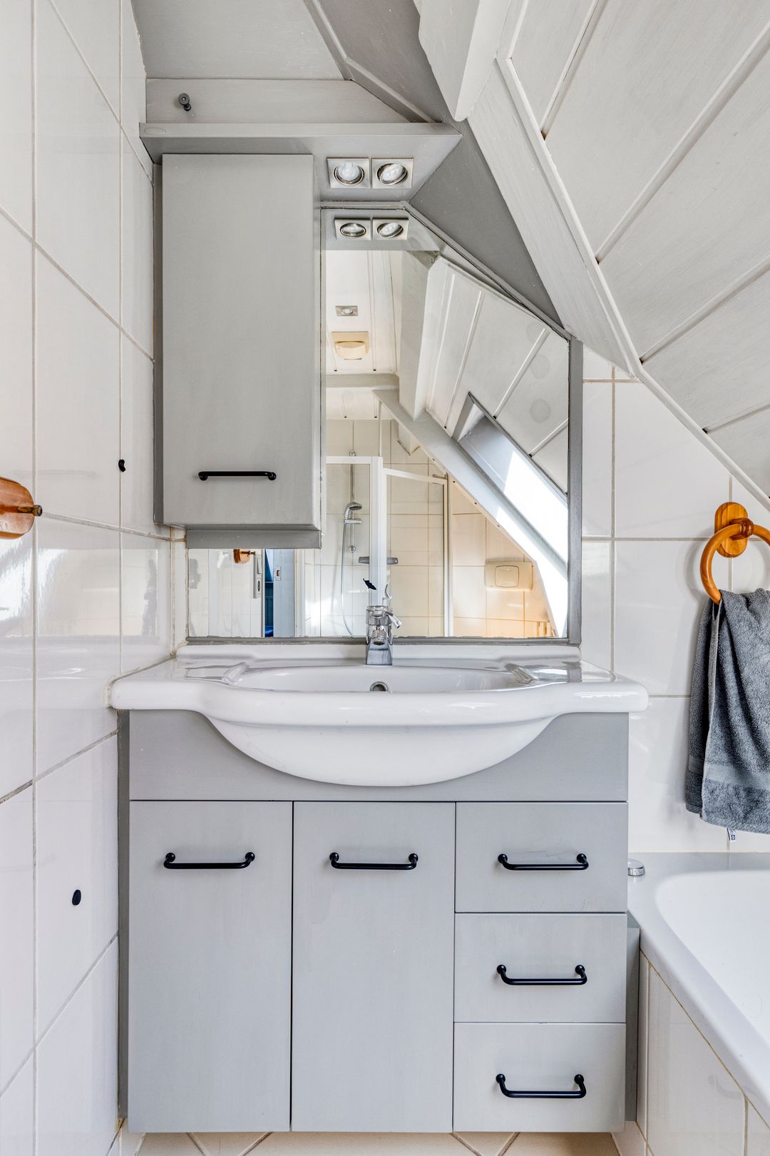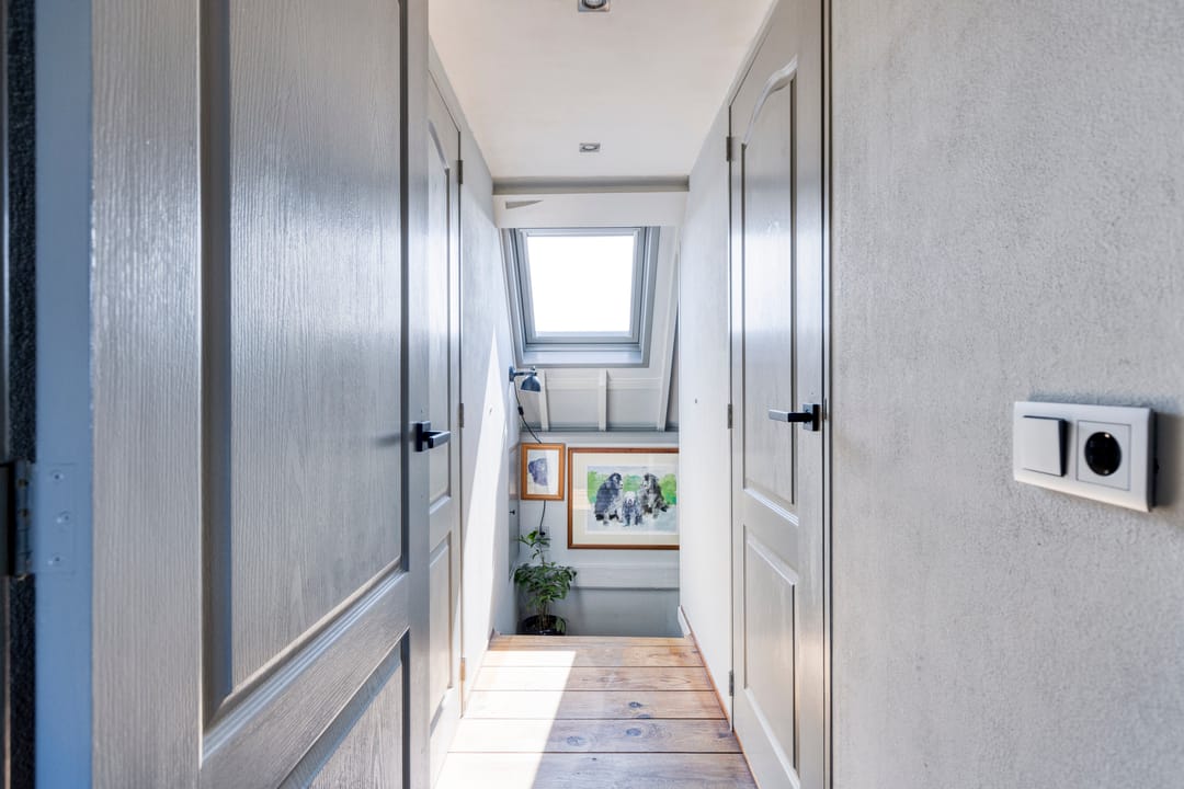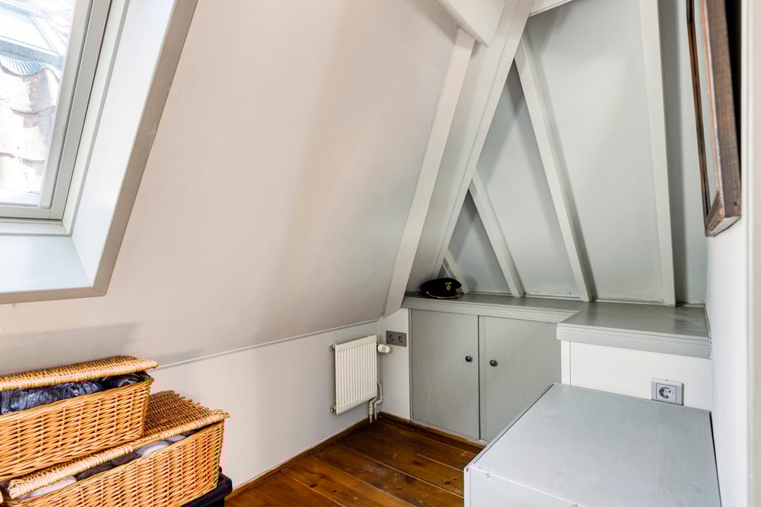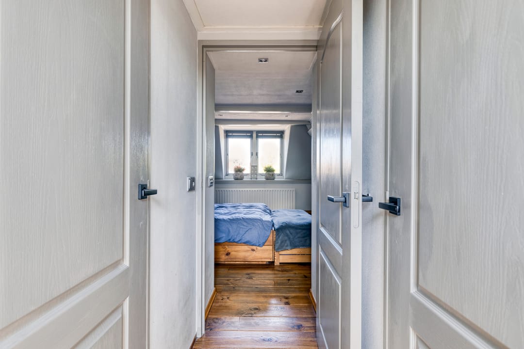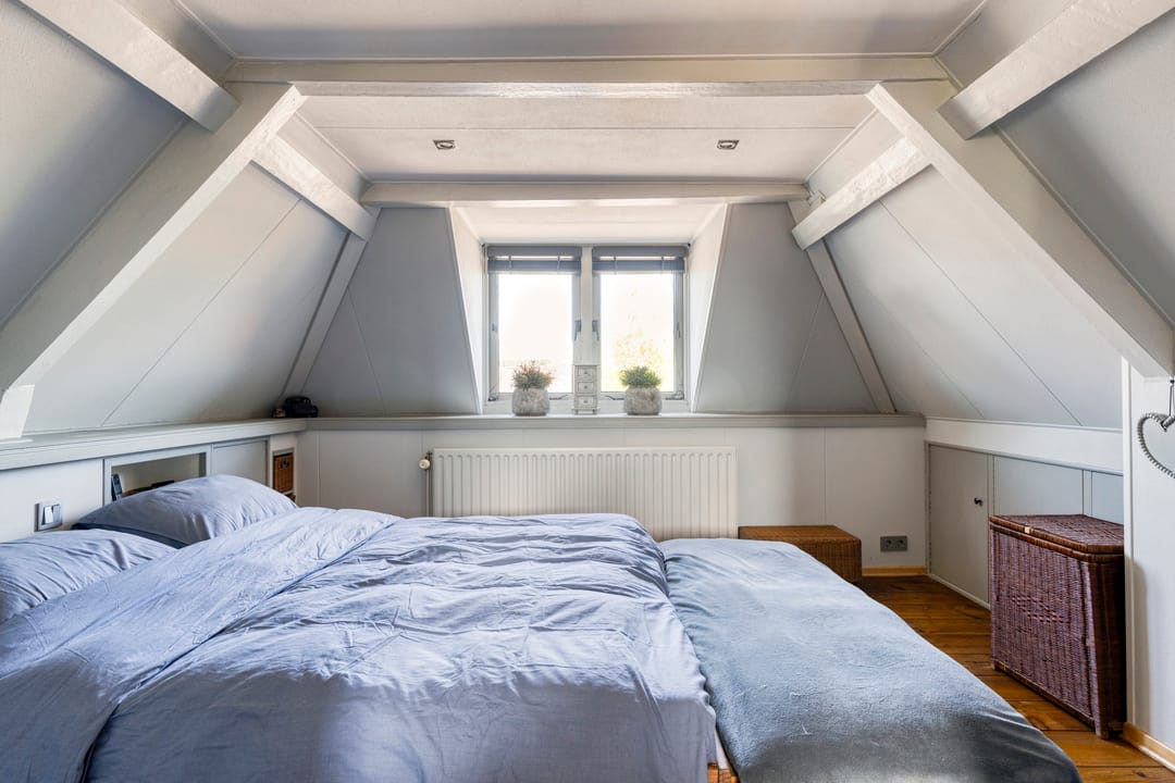 De tweede verdieping biedt een ruime slaapkamer met wederom dat leuke uitzicht, zelfs richting de jachthaven. Een fijne plek om de dag rustig te beginnen. De badkamer is compleet en comfortabel, en er is nog een extra kamer aanwezig – handig als logeerkamer of bijvoorbeeld kleedruimte.