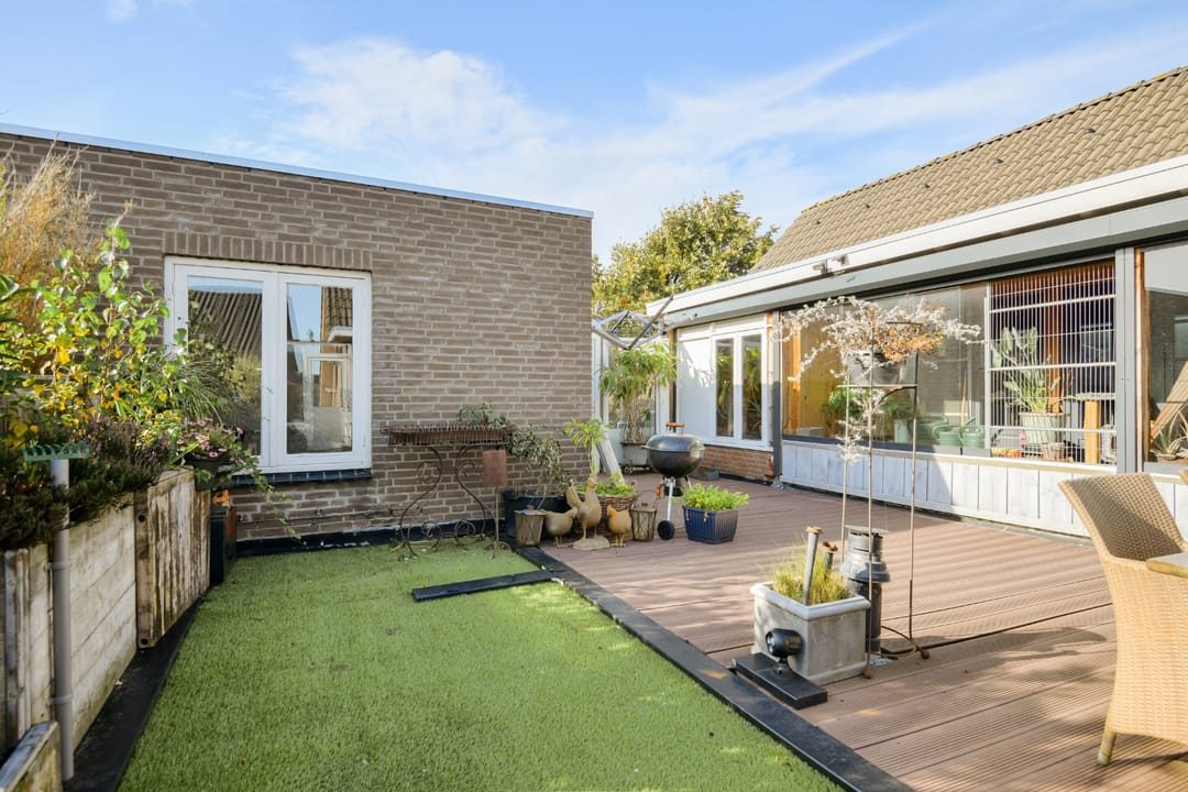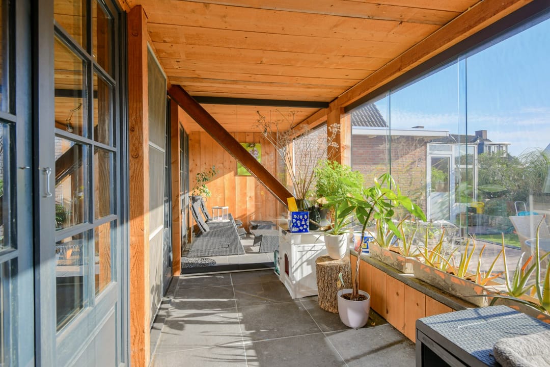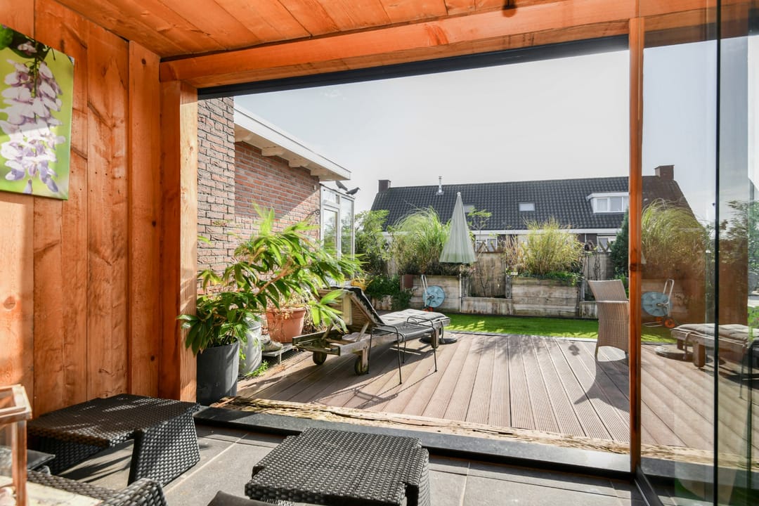 Vanuit de woonkamer kom je op het terras wat gelegen is op het zuidwesten. Een heerlijke plek wat een verlengstuk van je woning is. Het voorste deel is voorzien van grote raampartijen, zodat het ook in het voor- en naseizoen hier heerlijk zitten is. Het terras is grotendeels voorzien van kunststof vlonders en kunstgras en bloembakken. Aan de achterzijde is er een breed zonnescherm wat de nodige bescherming geeft.