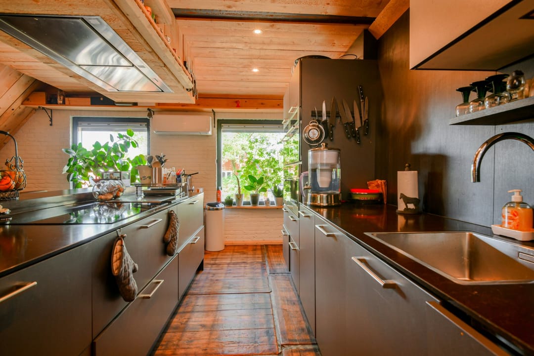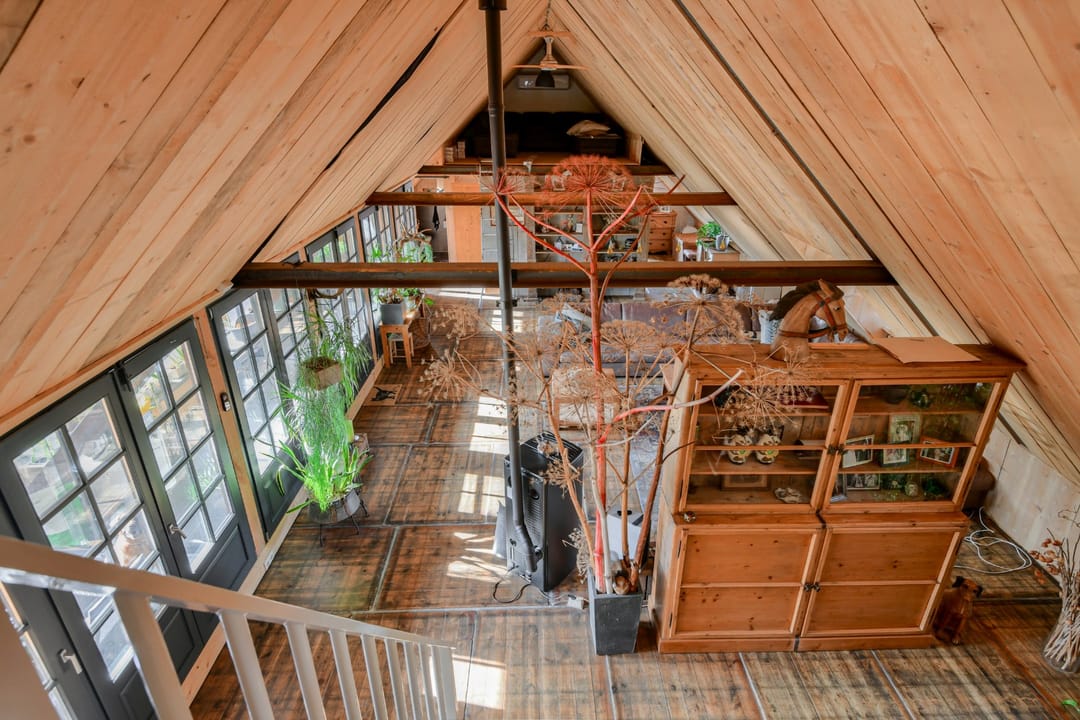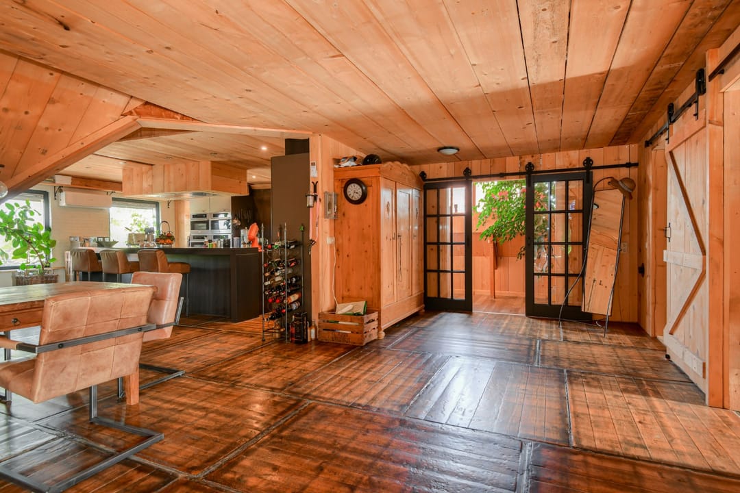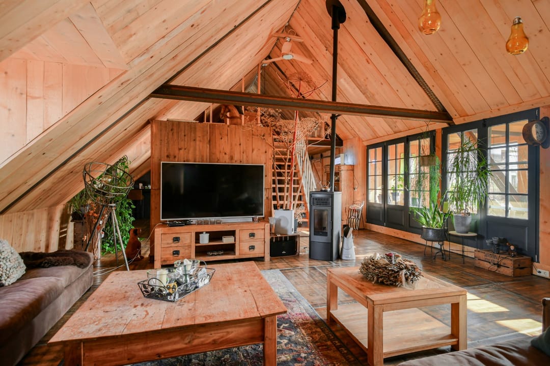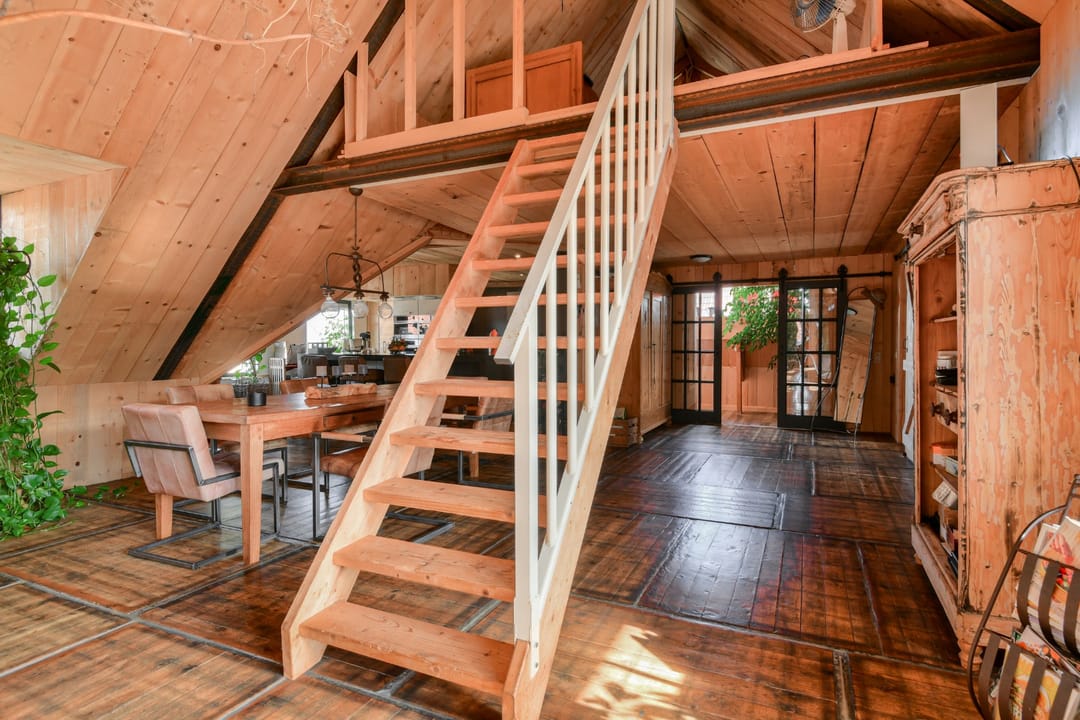 Voor de keuken is nu de eettafel opgesteld. Hier is ook een vaste trap naar de vide boven het eetgedeelte. Een leuken ruimte wat mogelijk gebruikt kan worden als kantoor of speelruimte voor de kinderen. Momenteel is het ingericht als slaapkamer.