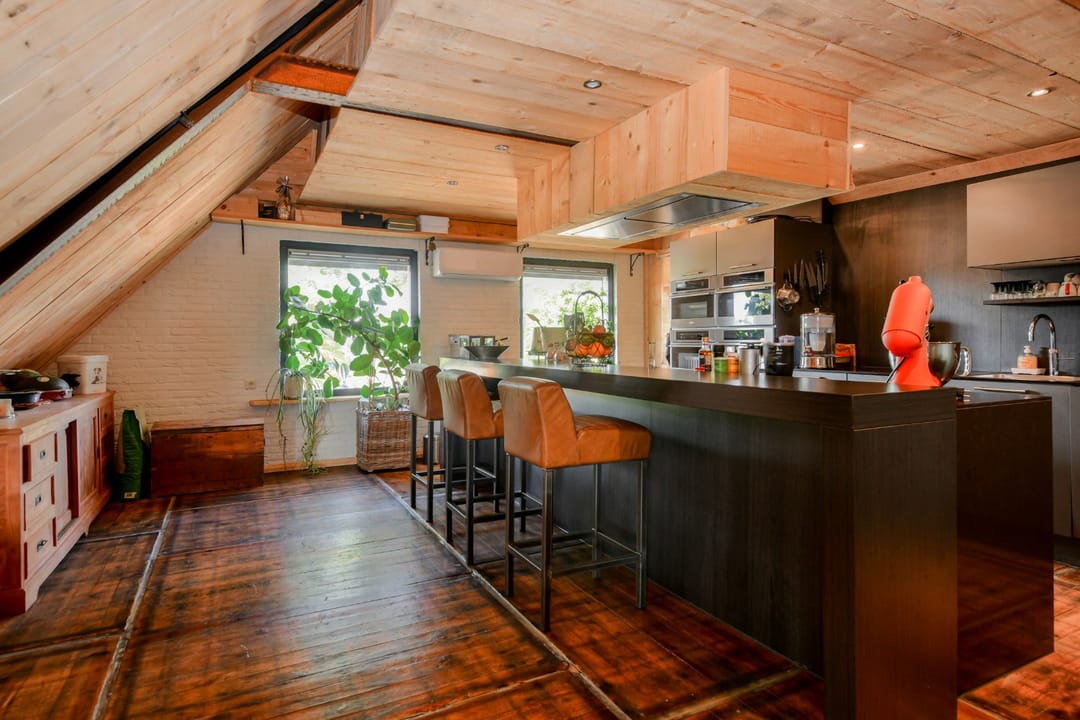 Boven de commerciële ruimte is er een zeer ruime bovenwoning met een woonoppervlak van ca. 239 m². Deze is toegankelijk via de trap in de hal op de begane vloer. Via de schuifdeuren kom je in de woonruimte. Deze heeft een warme uitstraling waar veel hout is verwerkt. Bij binnenkomst roept het de sfeer van een loft op. Je komt direct in de grote open keuken. Deze is zeer compleet uitgerust met meerdere moderne keukenapparaten, zoals ovens, ingebouwde vaatwasser, koelkast en vriezer en een inductiekookplaat met afzuiginrichting. Er zijn voldoende boven-, onderkasten en lades voor het opbergen van de keukenspullen. Het kookeiland met bar is de eyecatcher in deze ruimte. Achter de keuken is er nog een berging.