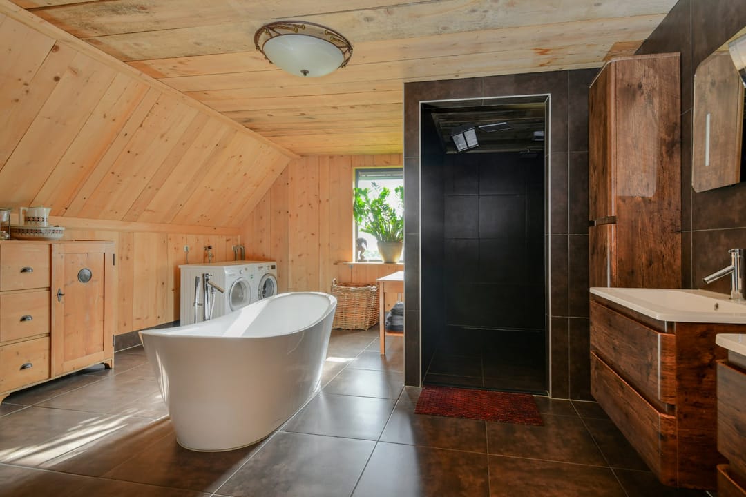 Bij binnenkomst in de bovenwoning is er aan de achterzijde de badkamer gelegen. Ook hier wordt je verrast door de ruimte en sfeer. De badkamer is uitgerust met een ligbad, centraal in de ruimte, een inloopdouche, toilet en twee wastafelmeubels met spiegels. In de badkamer zijn ook de aansluitingen voor de wasmachine en droger. In de badkamer staat een pellet kachel voor een comfortabele warmte.