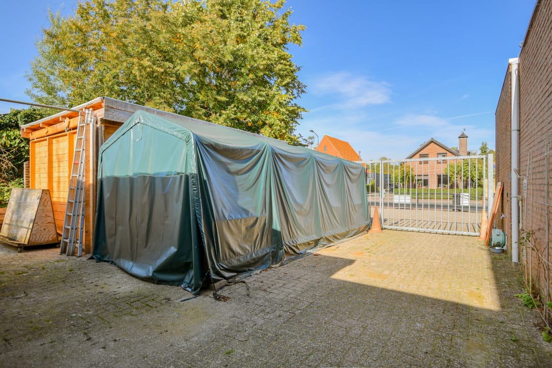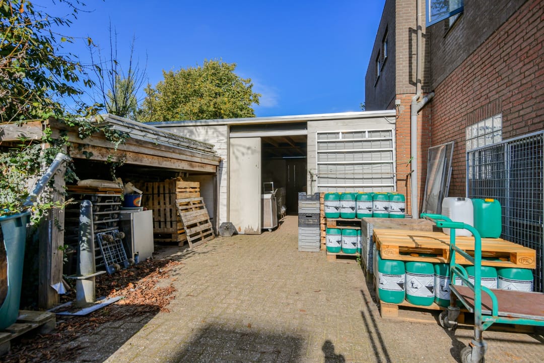 Aan de voorzijde is er een ruim parkeerterrein wat is af te sluiten met twee elektrisch bedienbare poorten. Het achterterrein is naast de opslagruimte is af te sluiten met een stalen hekwerk. Aan de rechterzijkant van het object staat een stenen schuur wat nu gebruikt wordt als opslagruimte.