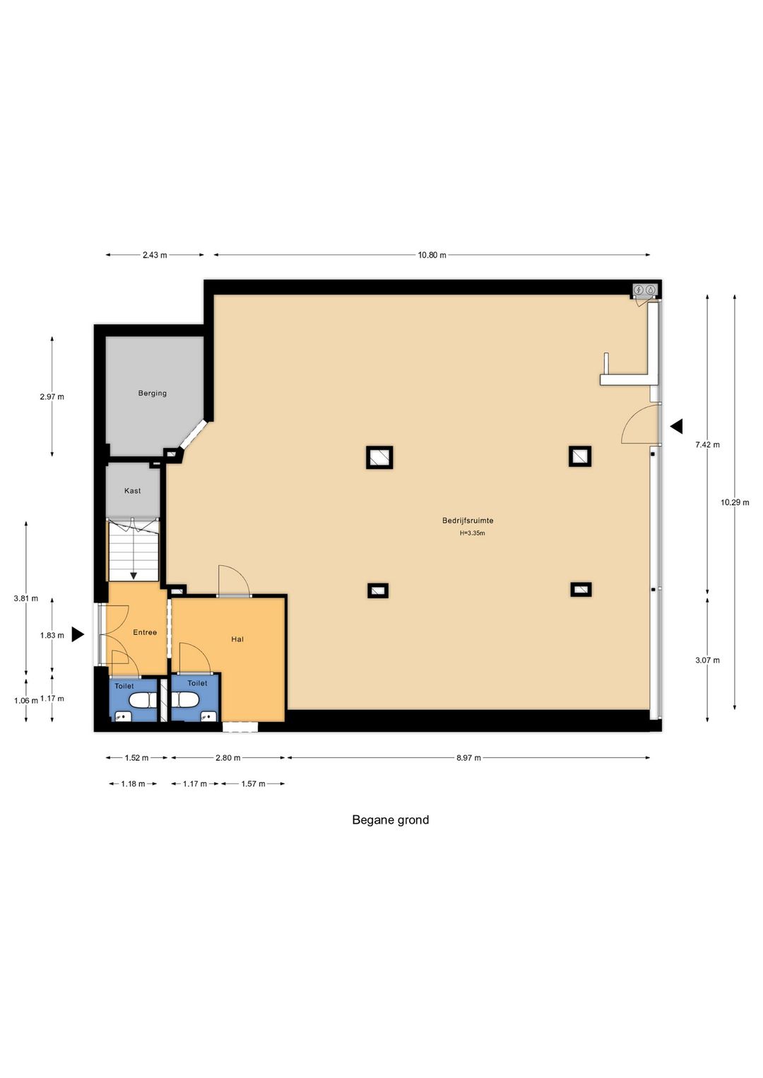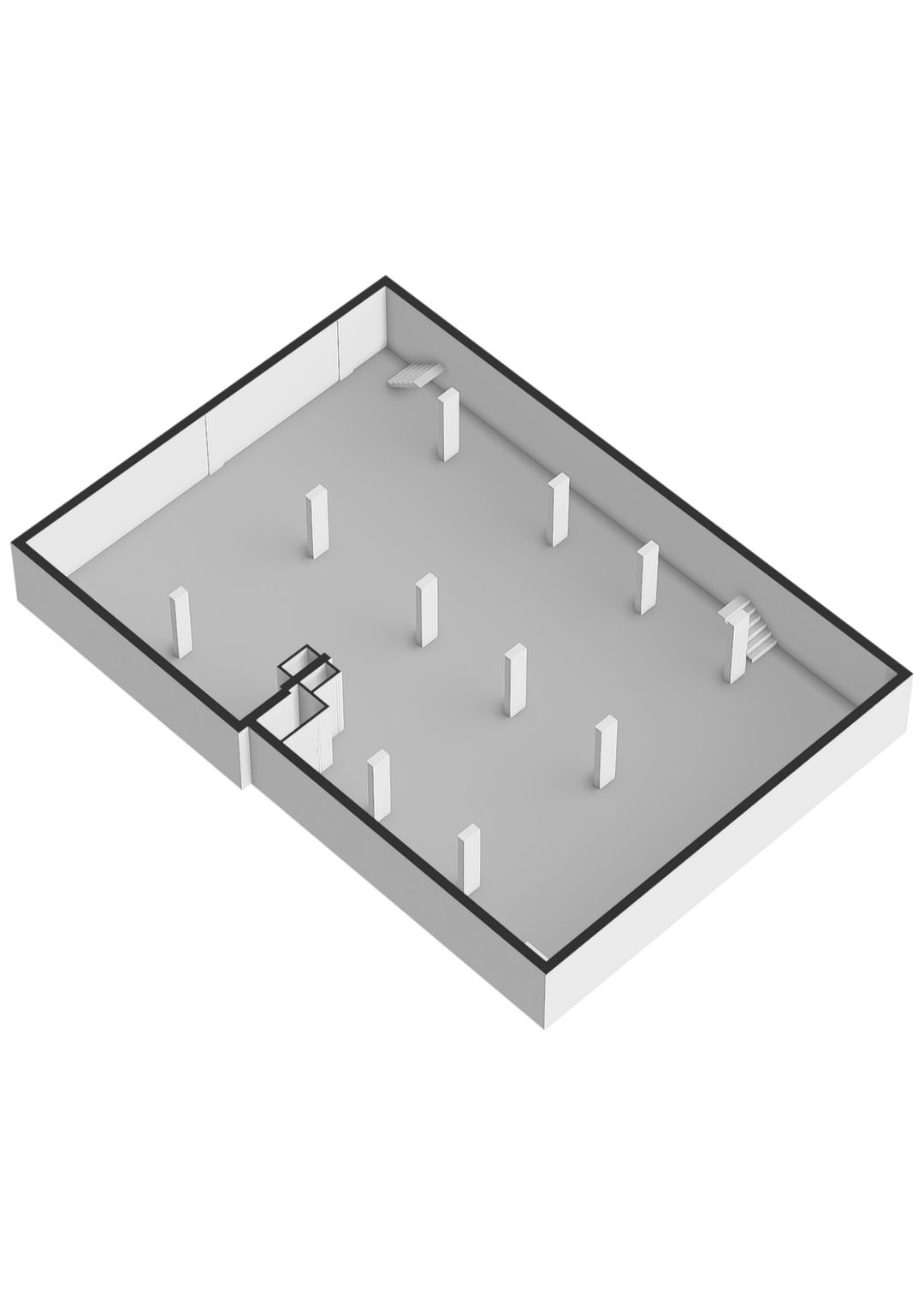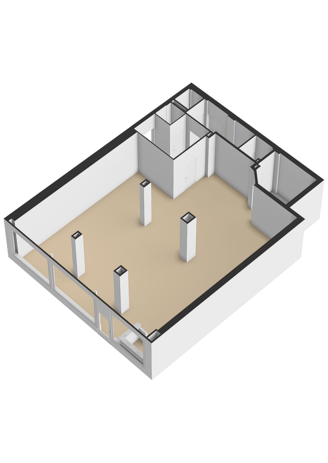 Entree aan voorzijde; open ruimte van ca. 10,25x11,95 voorzien van een laminaatvloer. Aan de achterzijde is een ruime berging, hal, 2x toilet. Trap naar de kelder en achterdeur naar buiten.