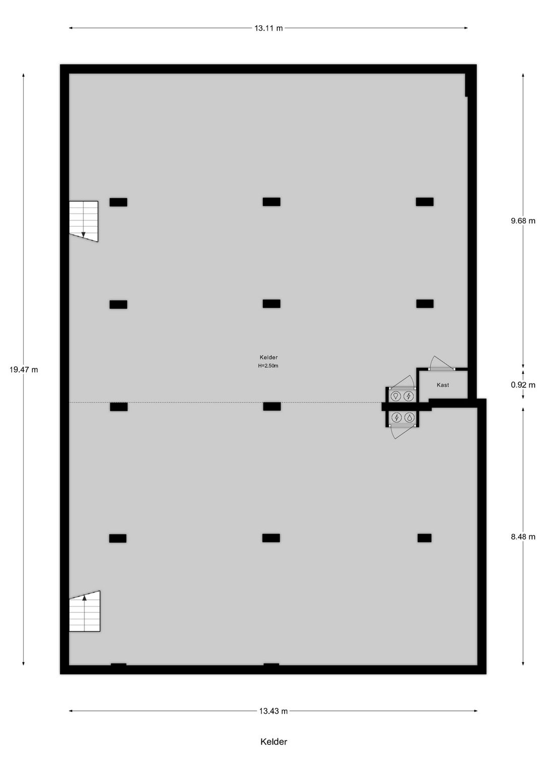 De kelder is ca 13x10 m., volledig open ruimte voorzien van elektriciteit.