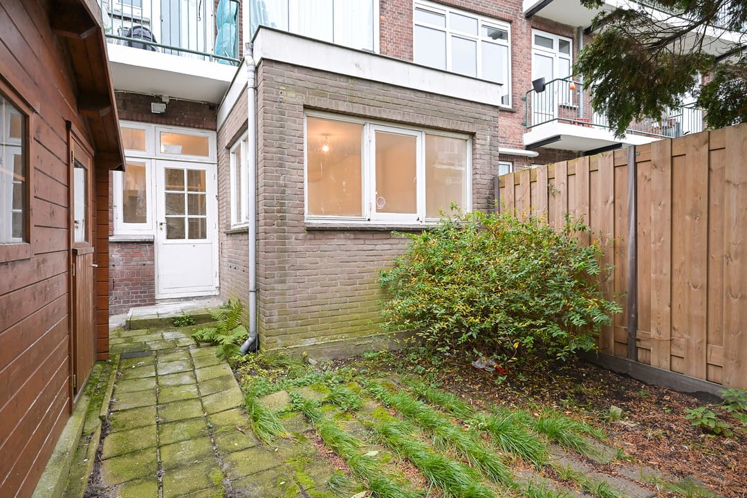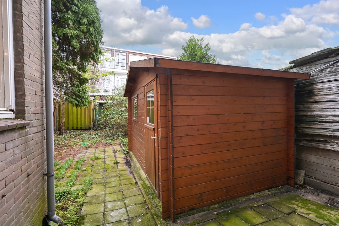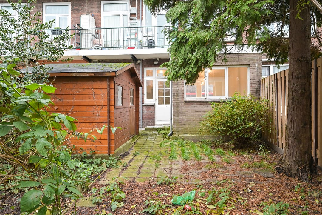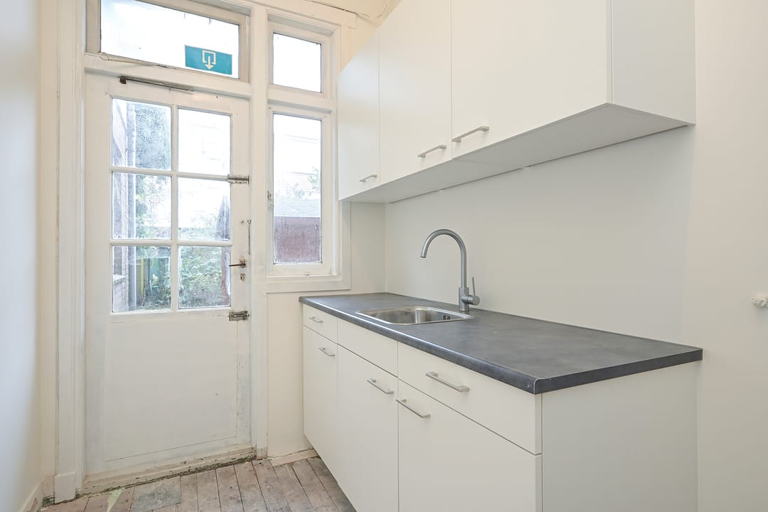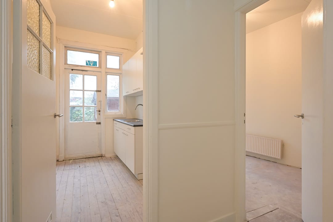 De entree bevindt zich centraal in de voorgevel. De indeling bestaat uit een royale, multifunctionele open ruimte die strak is afgewerkt met witte wanden en plafonds. Aan de achterzijde bevindt zich een moderne pantry en een afgesloten kantoor-/spreekkamer. Uniek voor deze locatie is de zeer diepe achtertuin van circa 75 m² v.v.o., inclusief een vrijstaande schuur van circa 15 m² v.v.o. voor extra opslag.