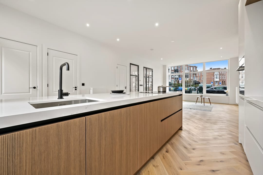 Via de eigen entree komt u binnen in de hal, separaat toilet en toegang tot de verschillende vertrekken. Aan de voorzijde bevindt zich de ruime woon-/werkkamer van circa 27 m², die door de grote raampartijen veel daglicht ontvangt en een prettige leefruimte vormt. Aan de achterzijde van de woning ligt de keuken van circa 14 m². De moderne keuken met kookeiland is voorzien van diverse inbouwapparatuur. Vanuit de keuken heeft u direct toegang tot de royale achtertuin van circa 54 m². Op deze verdieping bevindt zich tevens de badkamer van circa 6,5 m², die is voorzien van een inloopdouche en een badkamermeubel met dubbele wastafel.