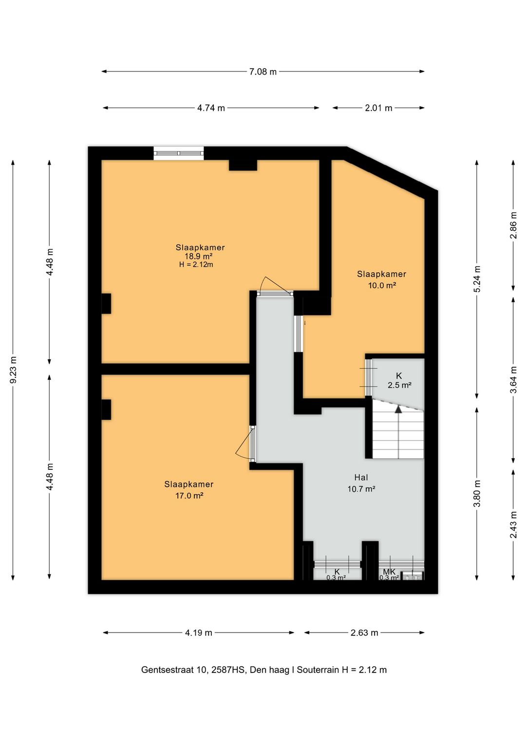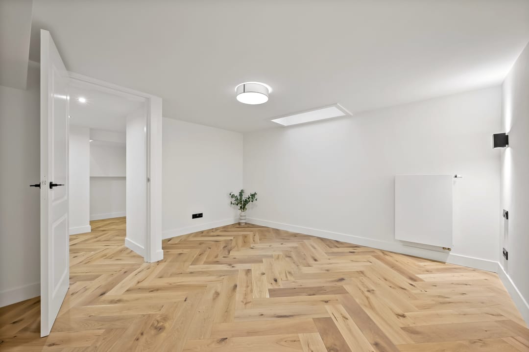 Via de trap bereikt u het souterrain (plafondhoogte circa 2,12 m). Hier bevinden zich drie ruime kamers van circa 19 m², 17m² en 10 m². Door de goede afmetingen zijn de kamers uitstekend geschikt als volwaardige werk/slaapkamers.
