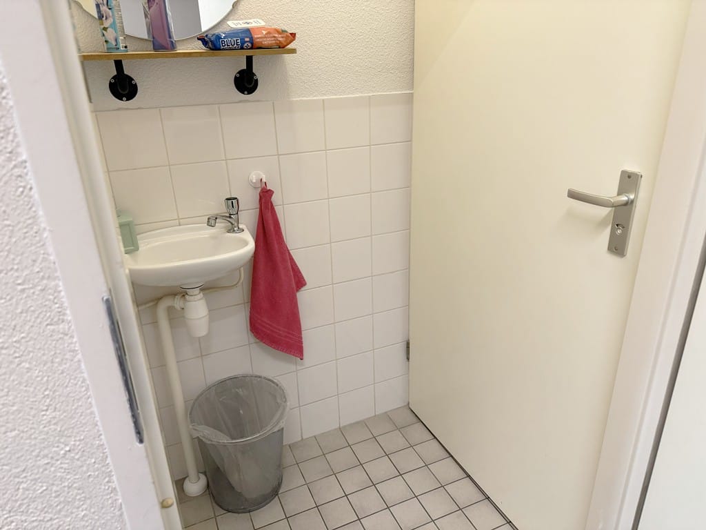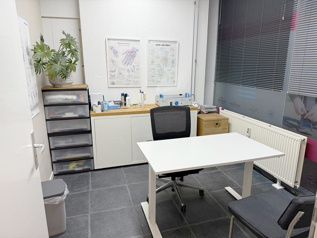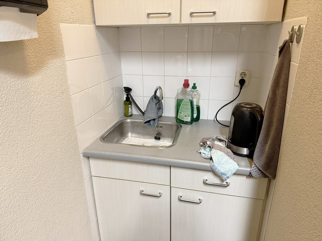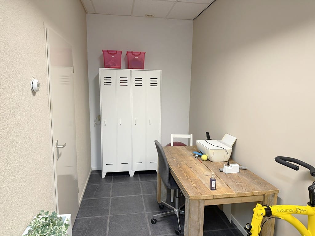 Indeling: dubbele deur als entree, de totale ruimte is 6,44m x 8,78m, er is een indeling gemaakt, grote entree hal, kantoor/behandelkamer, een pantry met close-in boiler en een toilet met voorportaal.