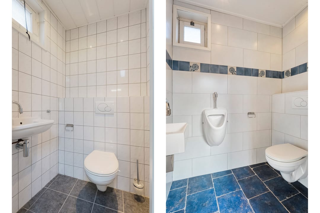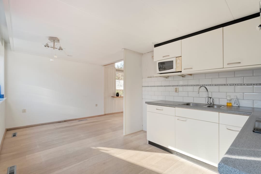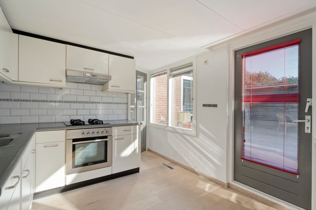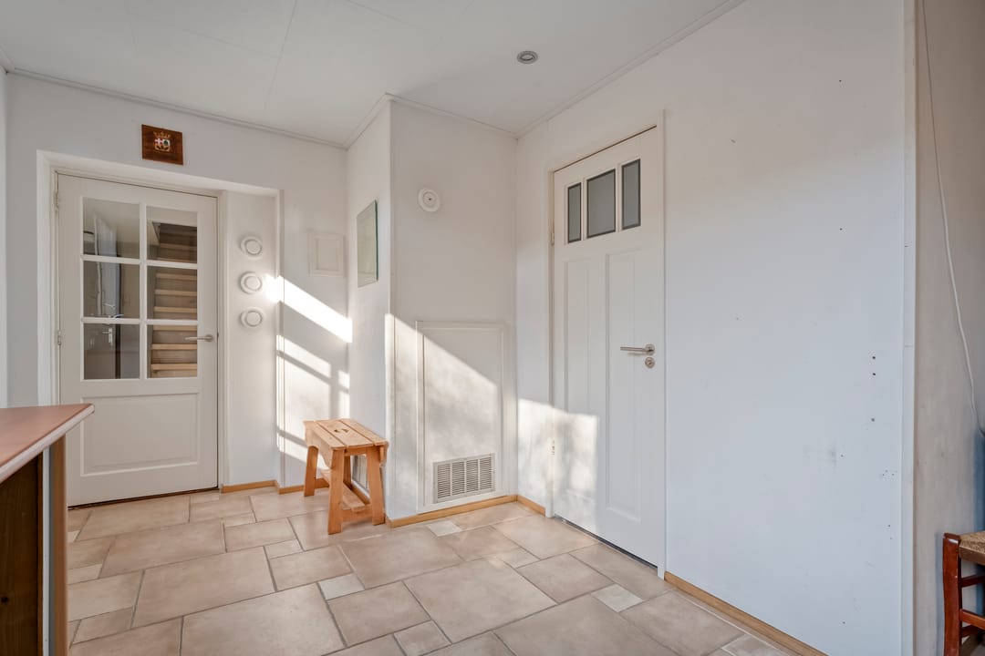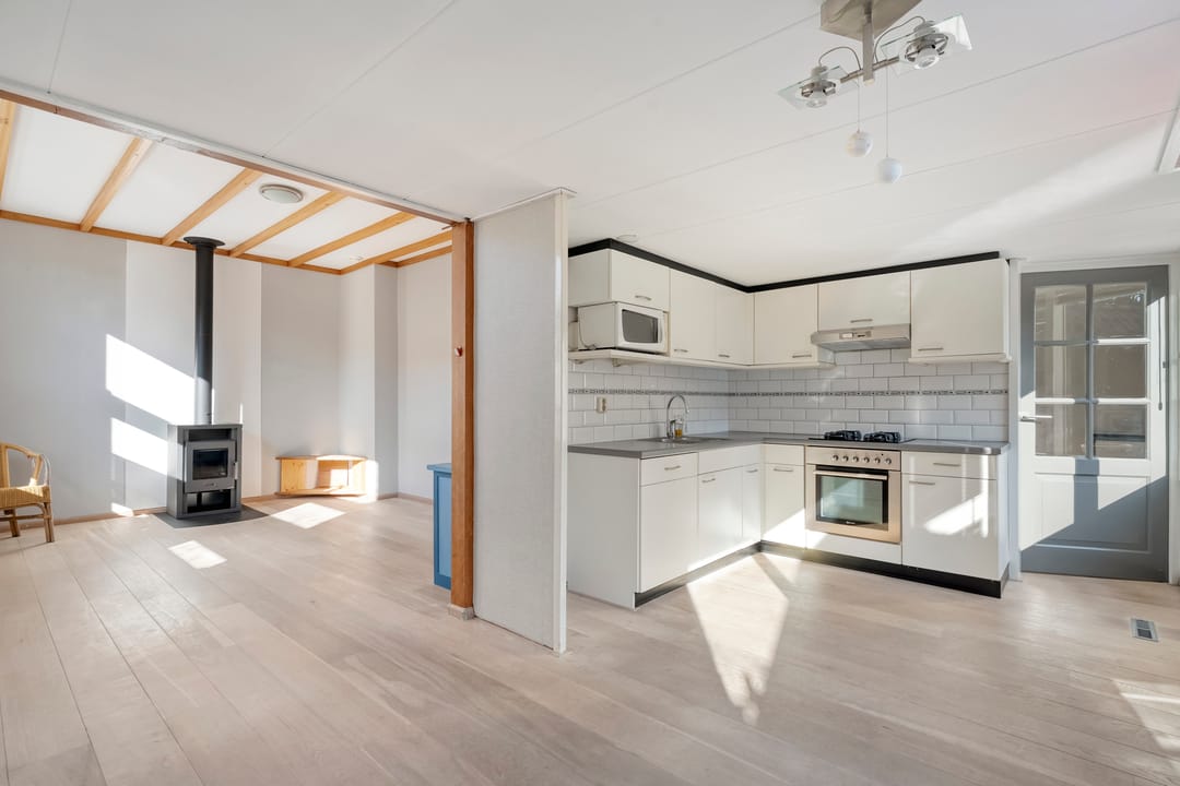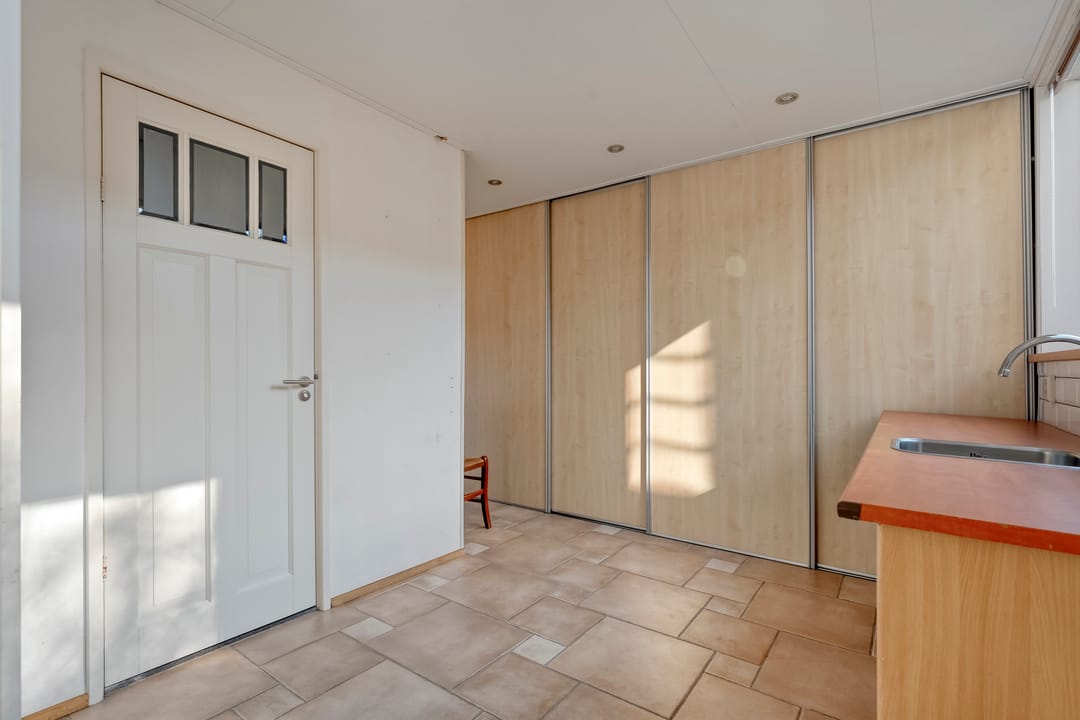 Woonhuis: hal met provisiekast, keuken, woonkamer met tuindeur, bijkeuken met vaste kasten en het toilet.