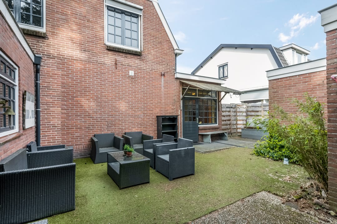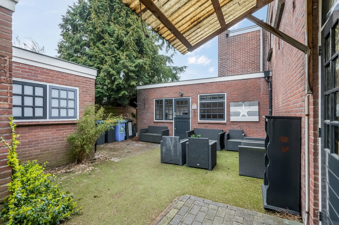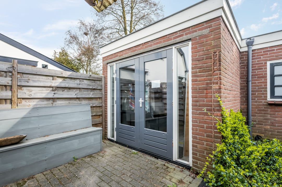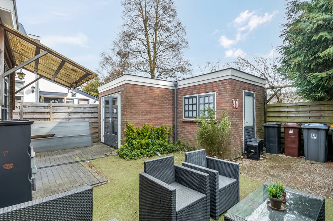 De achtertuin beschikt over een bijgebouw (voorheen garage) die is voorzien van een kozijn en verwarming. Hierdoor is deze ruimte uitermate geschikt als hobbyruimte, werkplek, praktijkruimte of zelfs als verlengstuk van de woning.