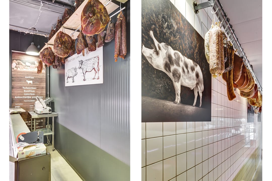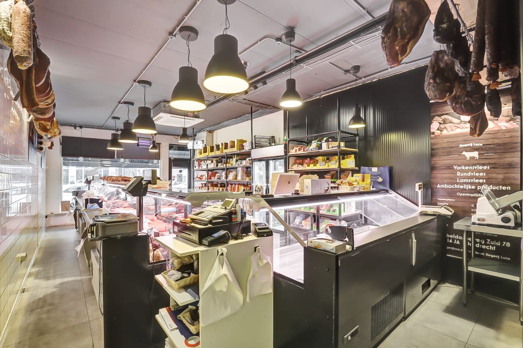 Indeling op de begane grond: achter ligt een volledig ingerichte ambachtelijke slagerij met eigen productie en aan de voorkant ligt het winkelgedeelte met koelvitrines en mooie kasten.